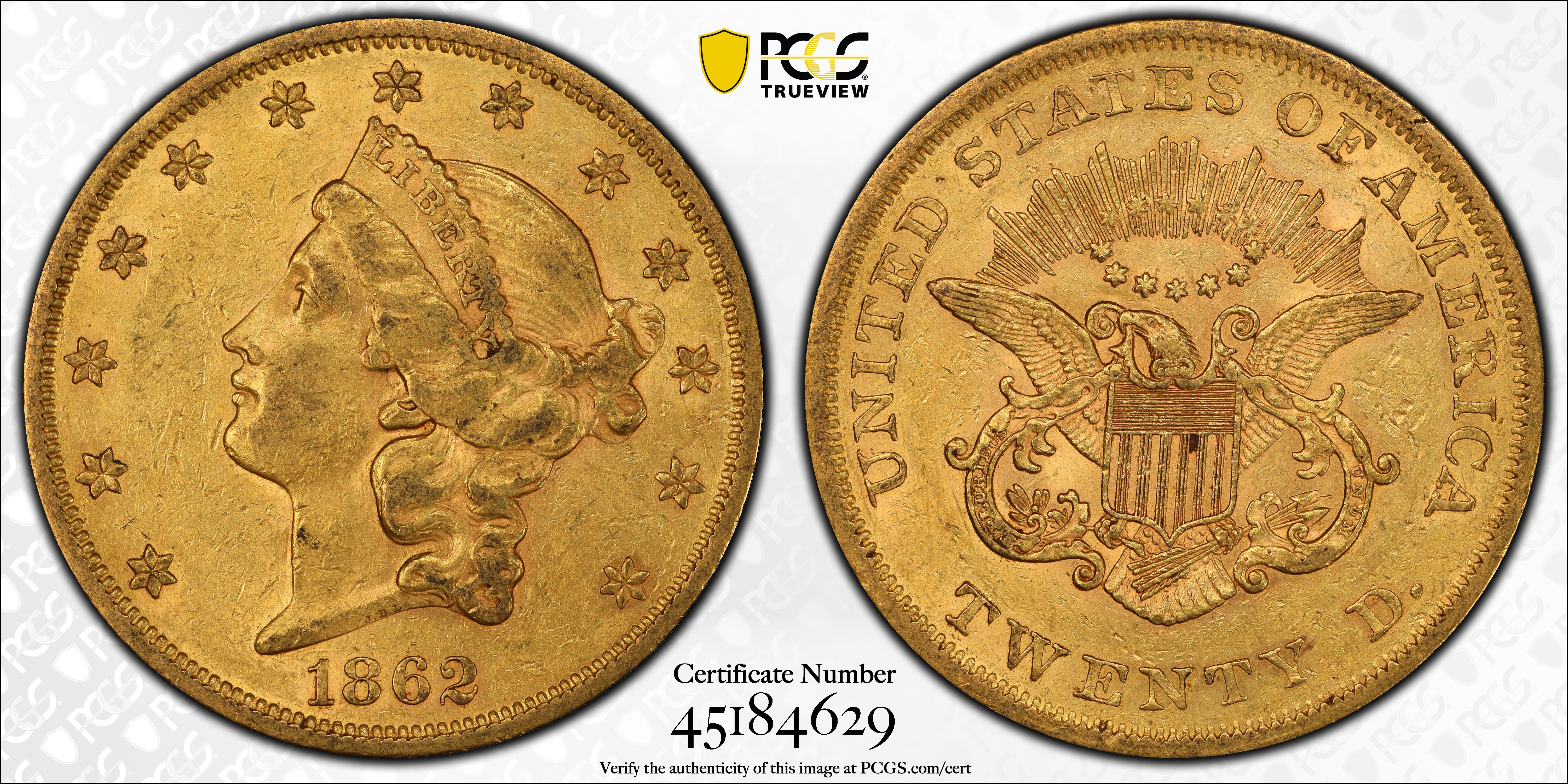 1862 $20 AU58 Certification #45184629, PCGS #8937