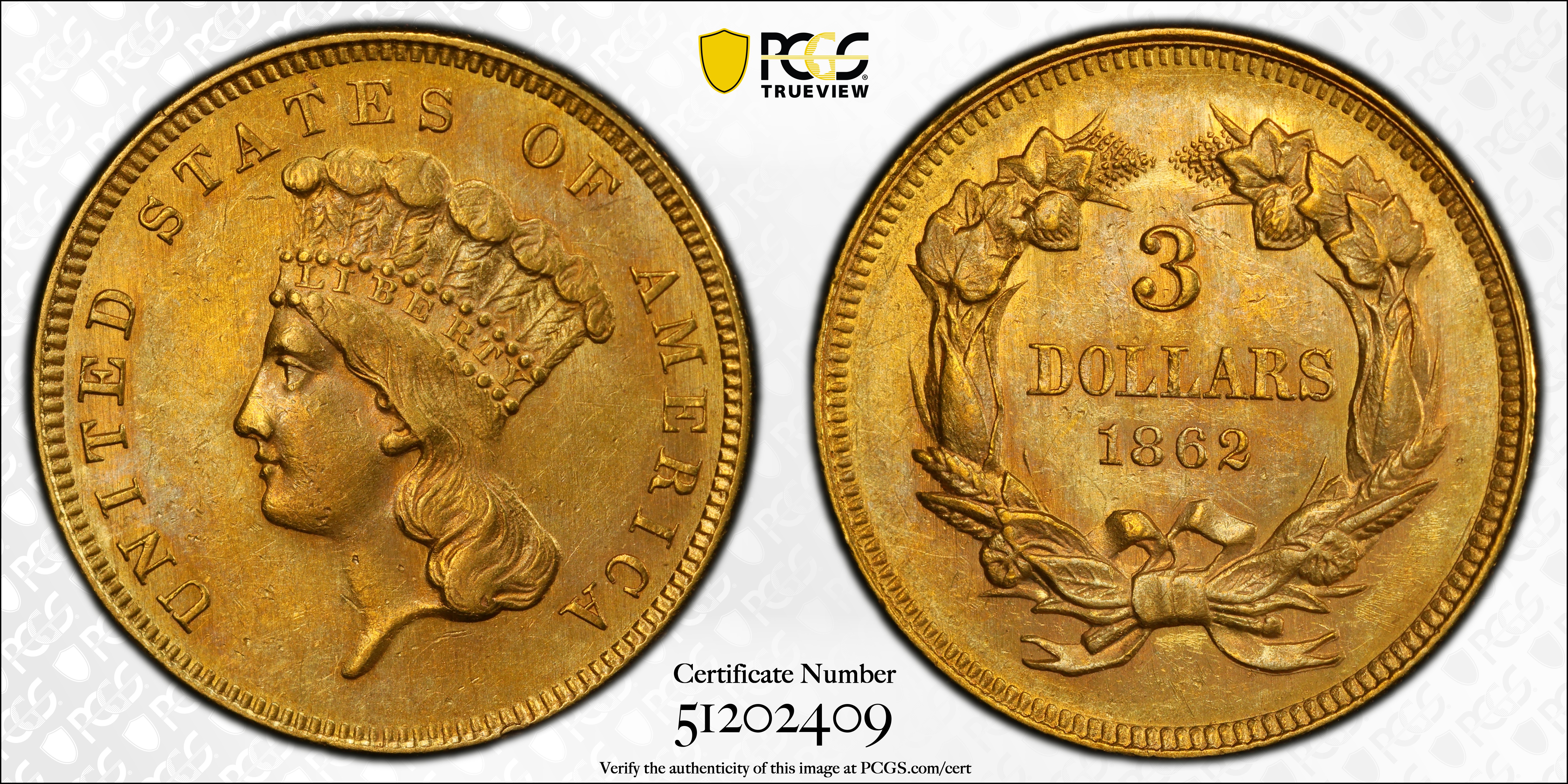 1862 $3 AU58 Certification #51202409, PCGS #7983