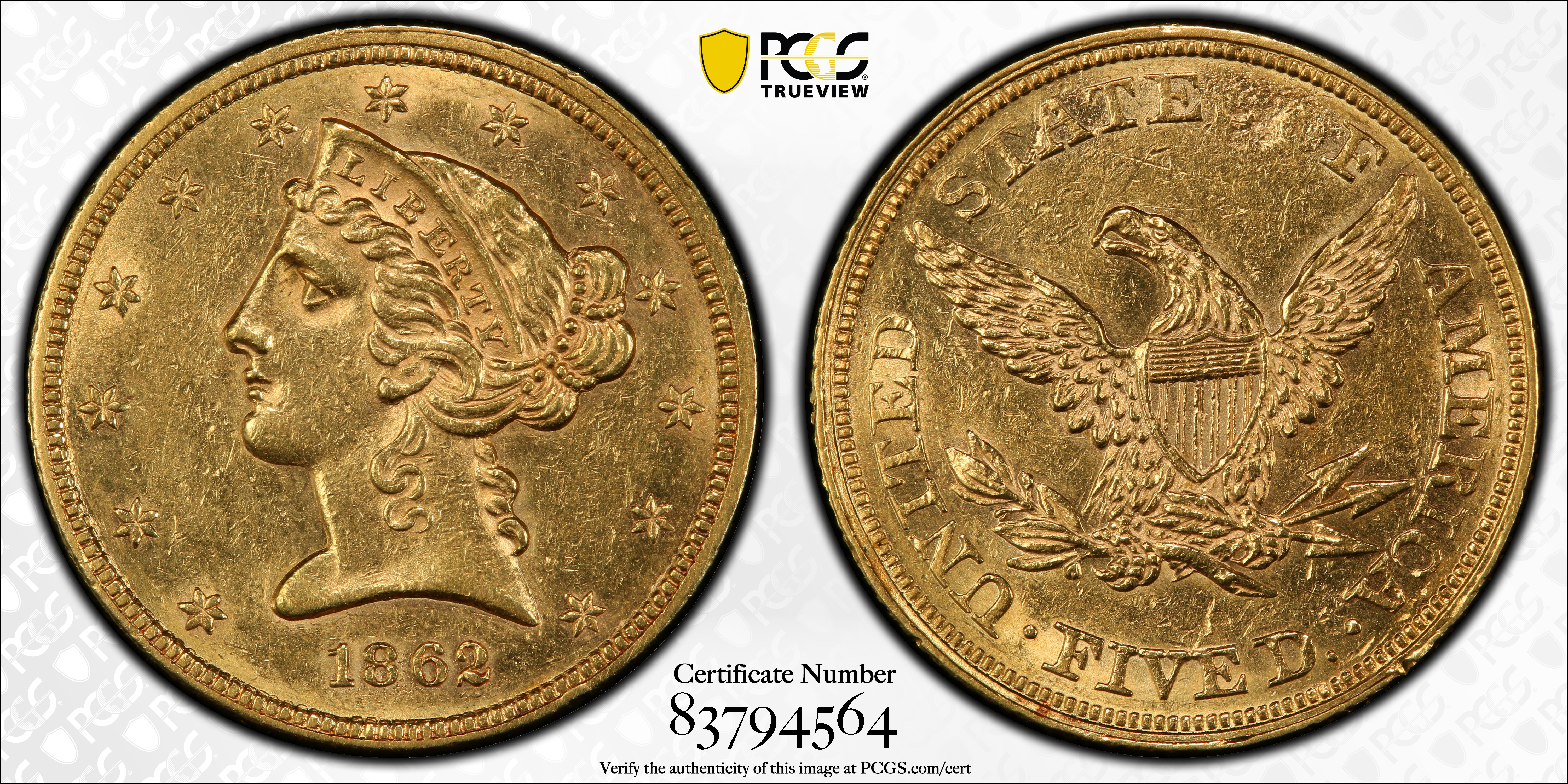 1862 $5 AU58 Certification #83794564, PCGS #8292
