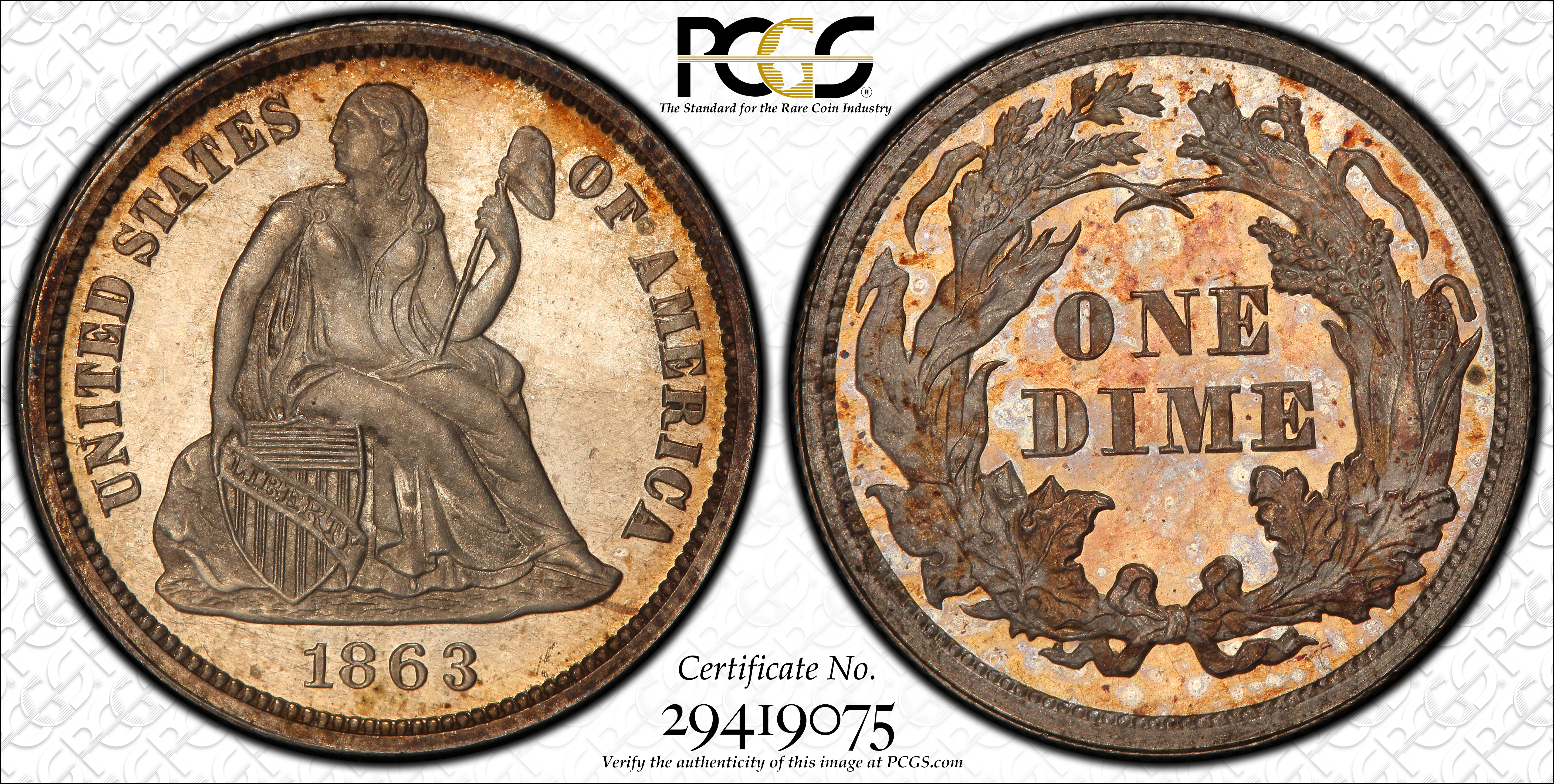 1863 10C, CAM PR65CAM Certification #29419075, PCGS #84756