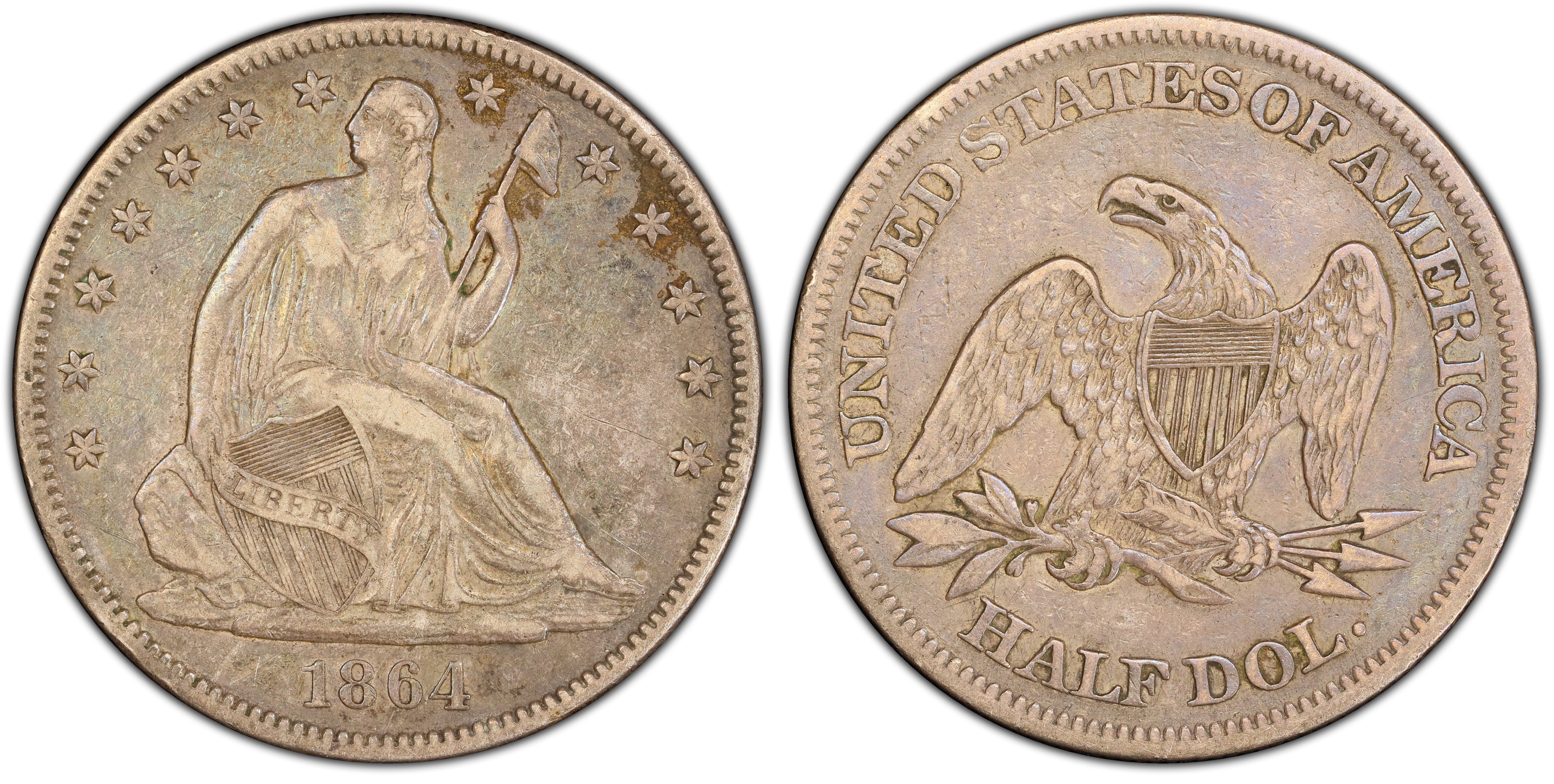 The 1864 Half Dollar is a great date with a low mintage. Mint State examples are not particularly scarce, which is probably due to the discovery of some of them in the so-called "Guatemala Hoard" in the 1950's (other dates were included in the hoard, as well). Most Mint State 1864 Half Dollars are of average quality, though there are some outstanding examples, including a tiny population at the MS67 level. Most 1864 Half Dollars exhibit strong strikes -- the best ones show full feather and fletch details on the reverse.