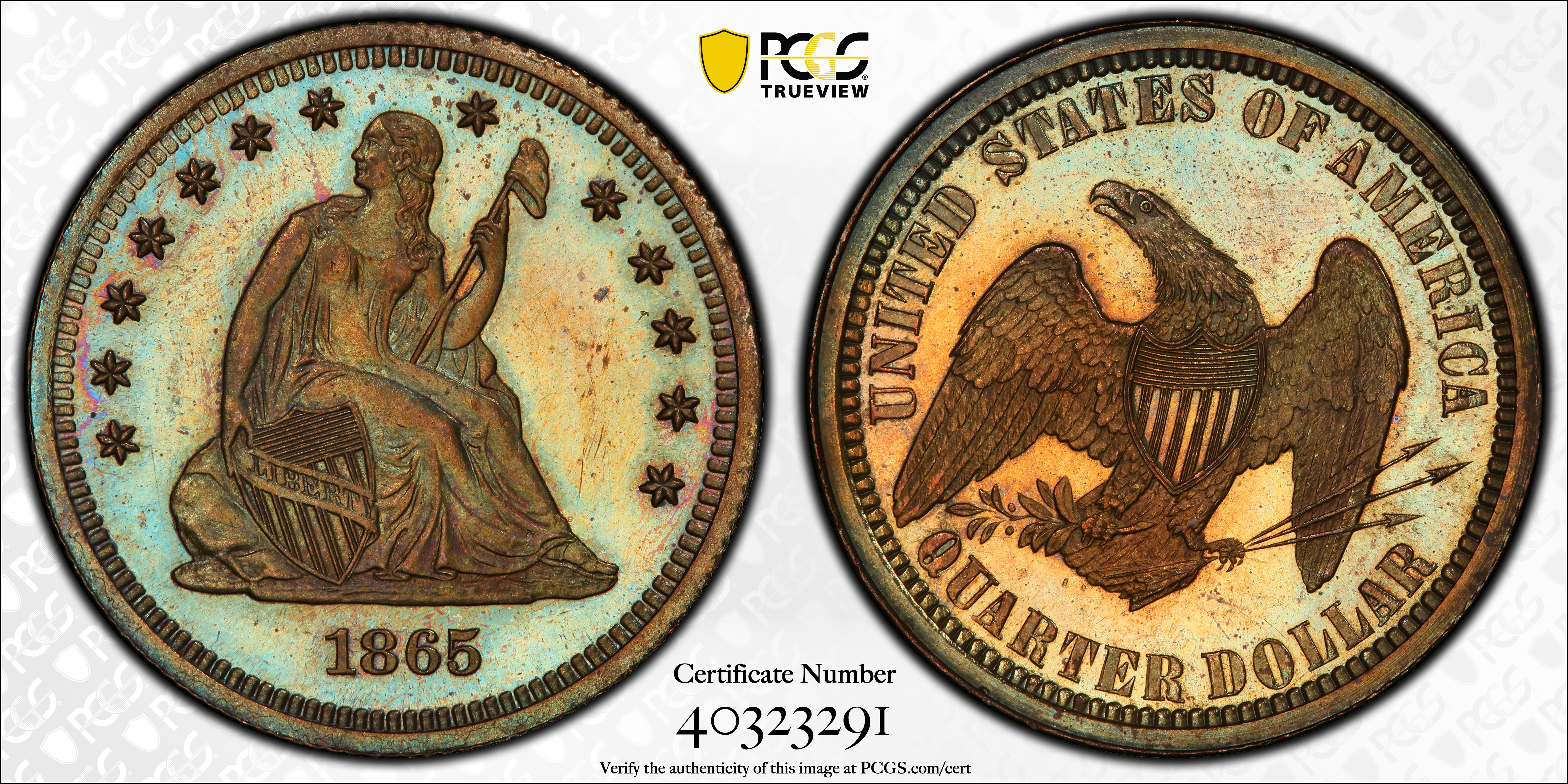 1865 25C J-424, BN PR65BN Certification #40323291, PCGS #60608
