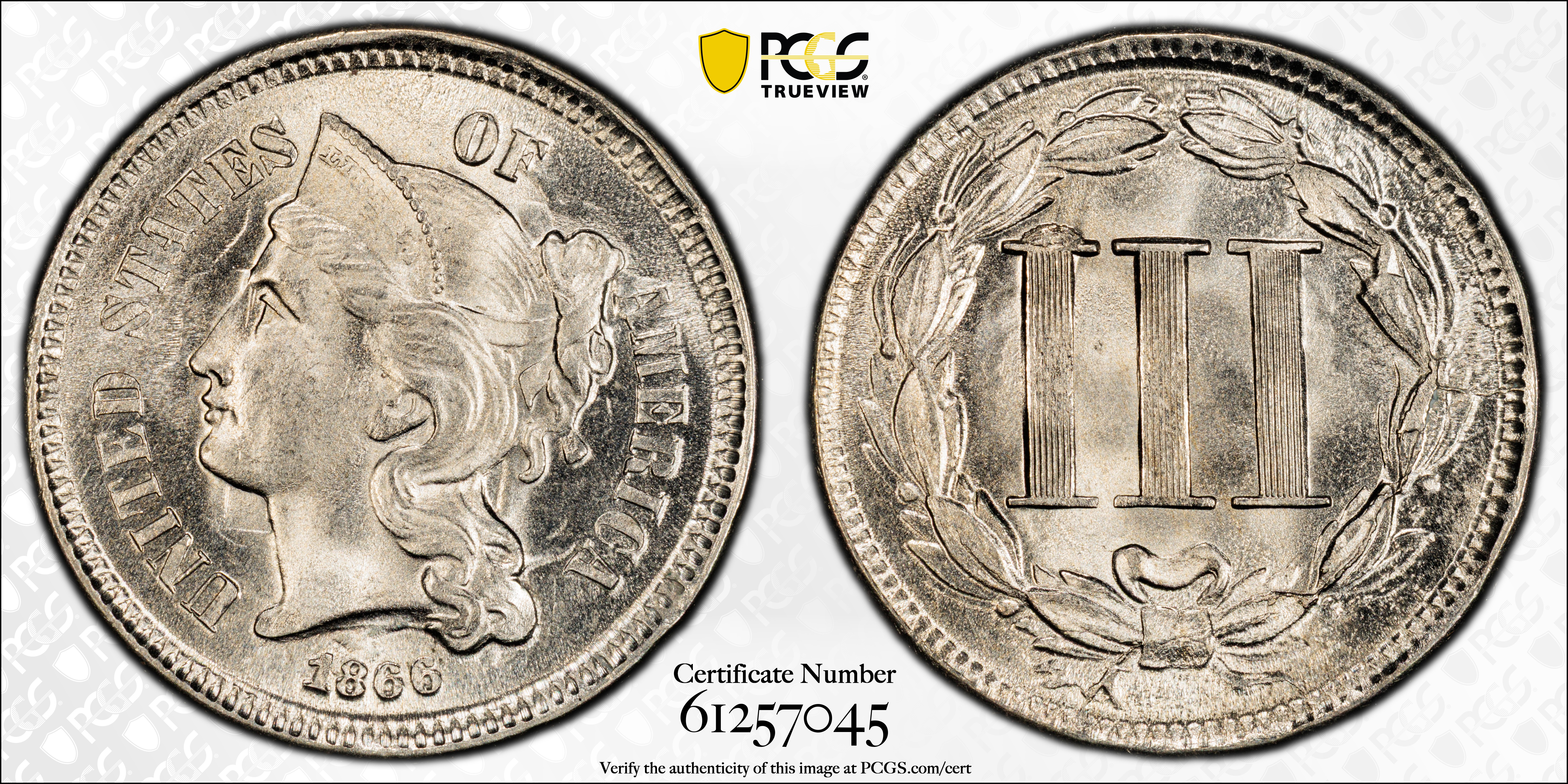 1866 3CN MS65 Certification #61257045, PCGS #3732
