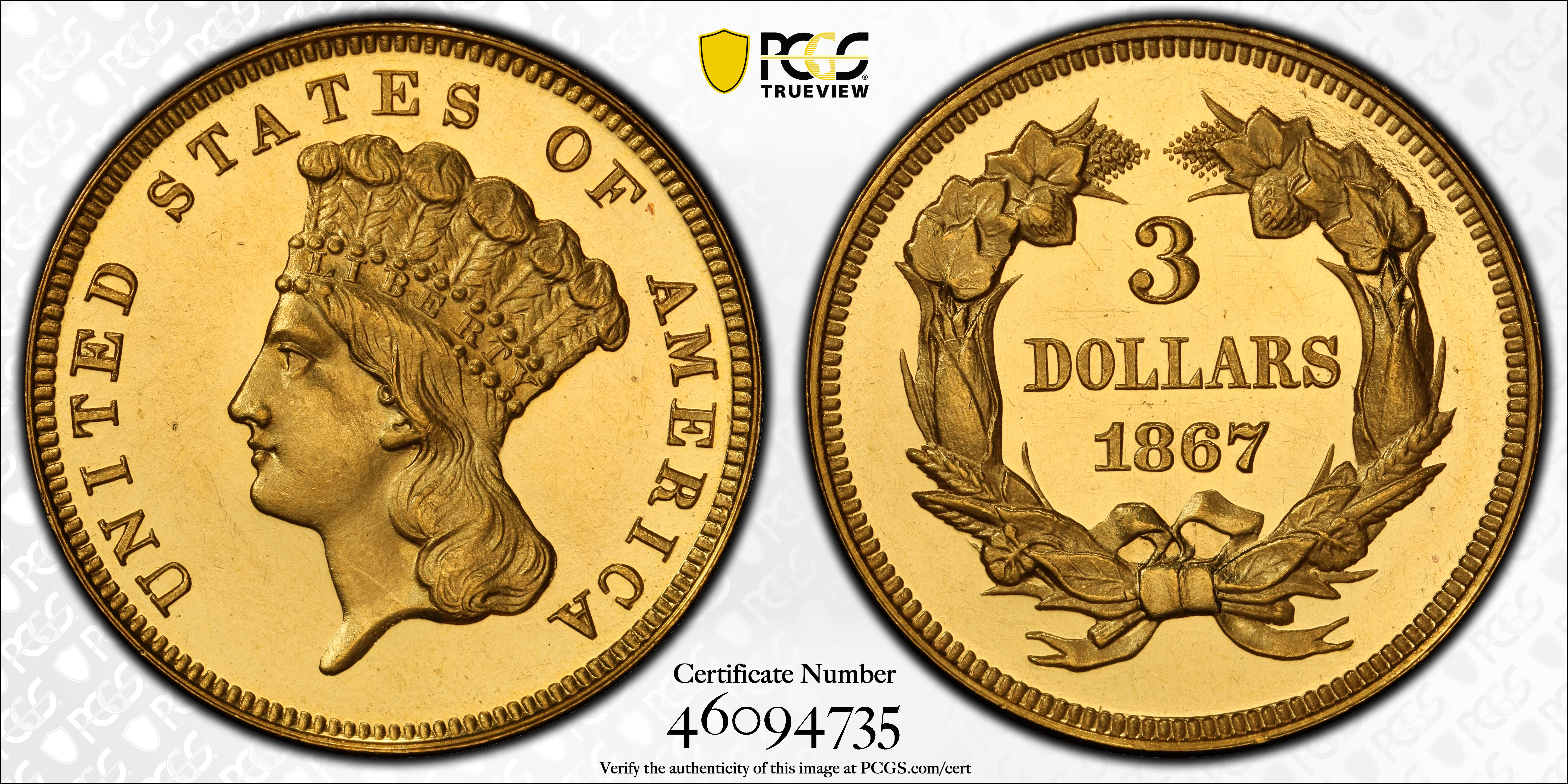 1867 $3, DCAM PR64DCAM Certification #46094735, PCGS #98030