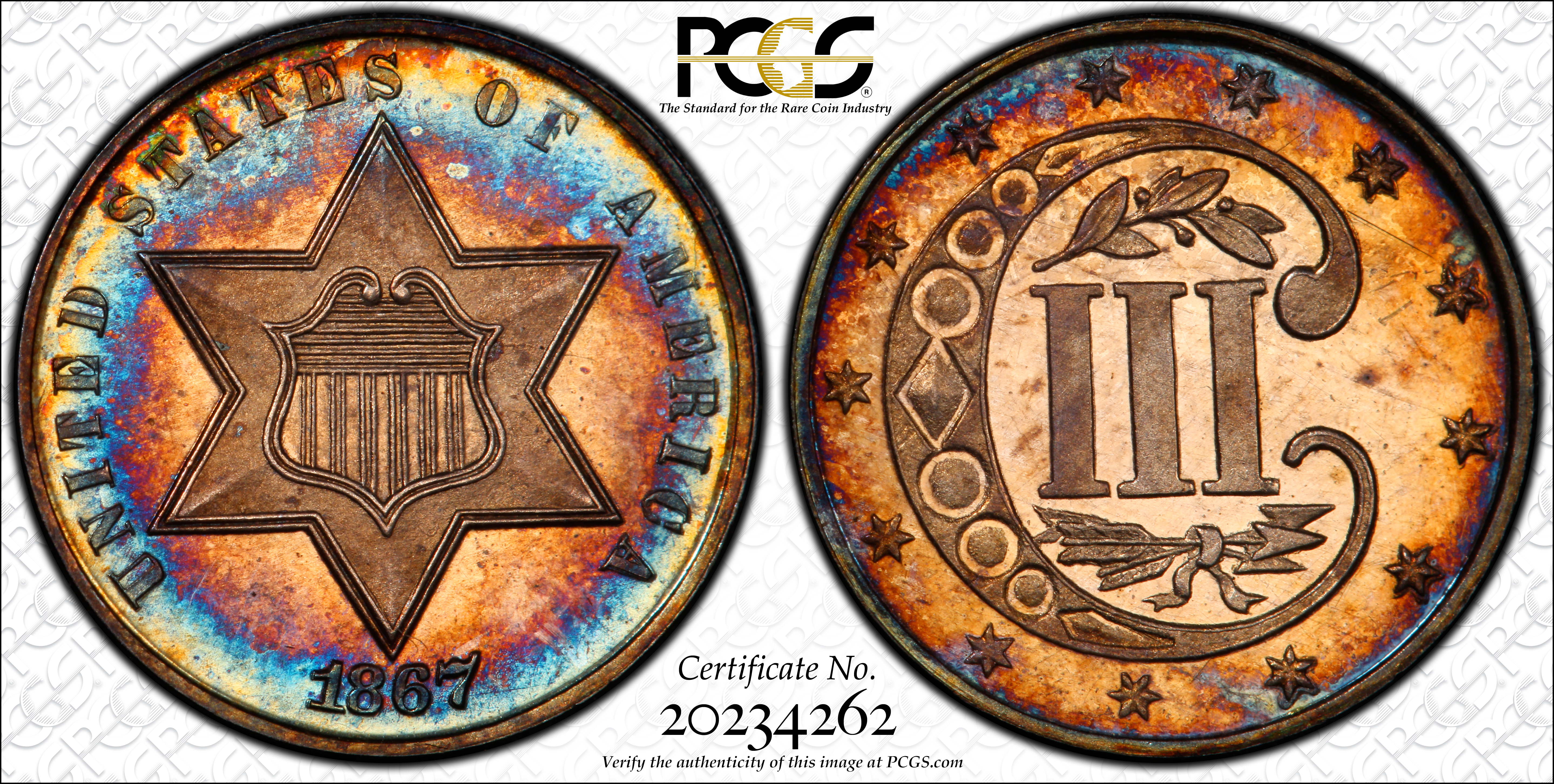 1867 3CS PR65+ Certification #20234262, PCGS #3717