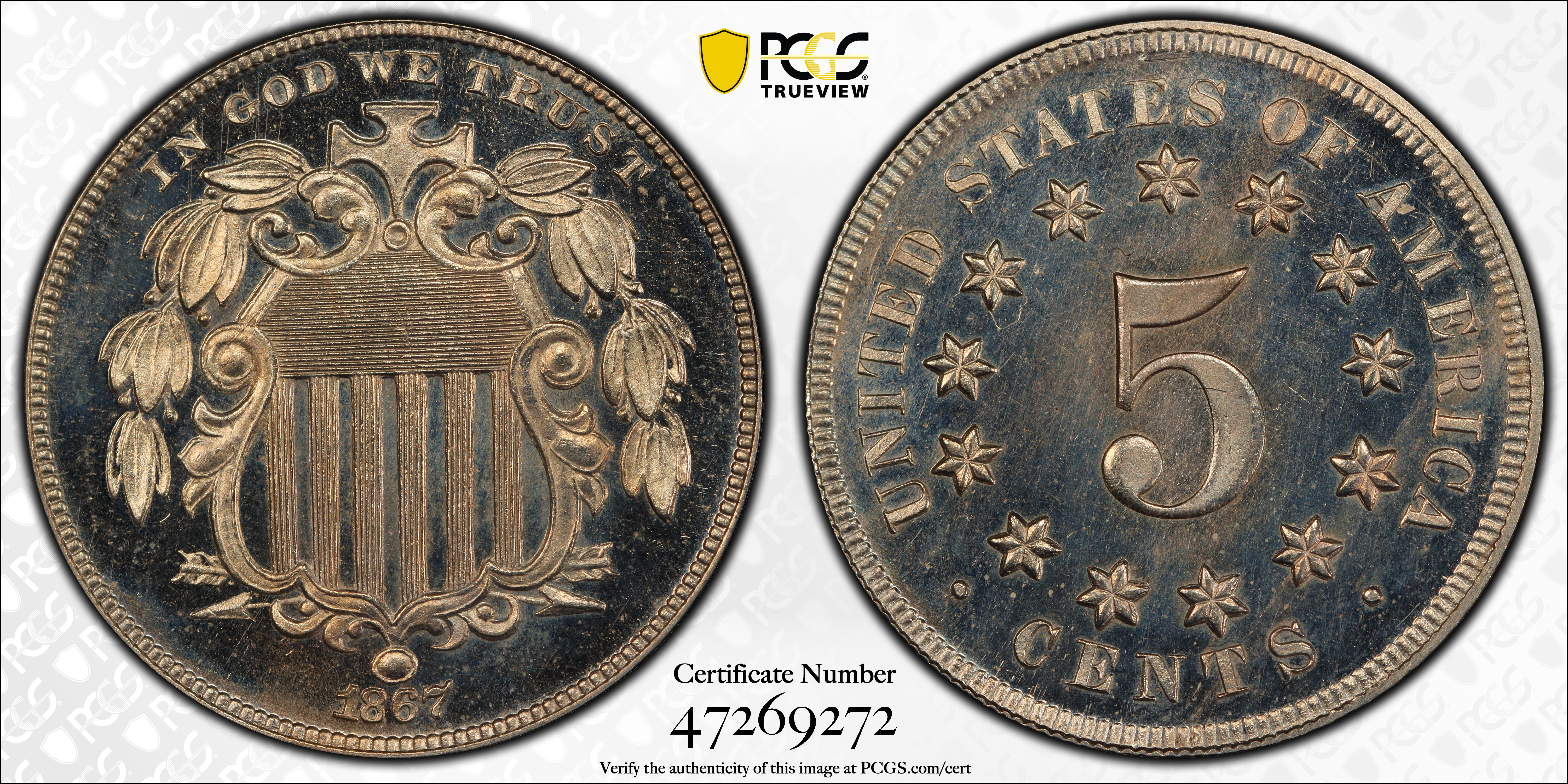 1867 5C No Rays, DCAM PR64DCAM Certification #47269272, PCGS #93821
