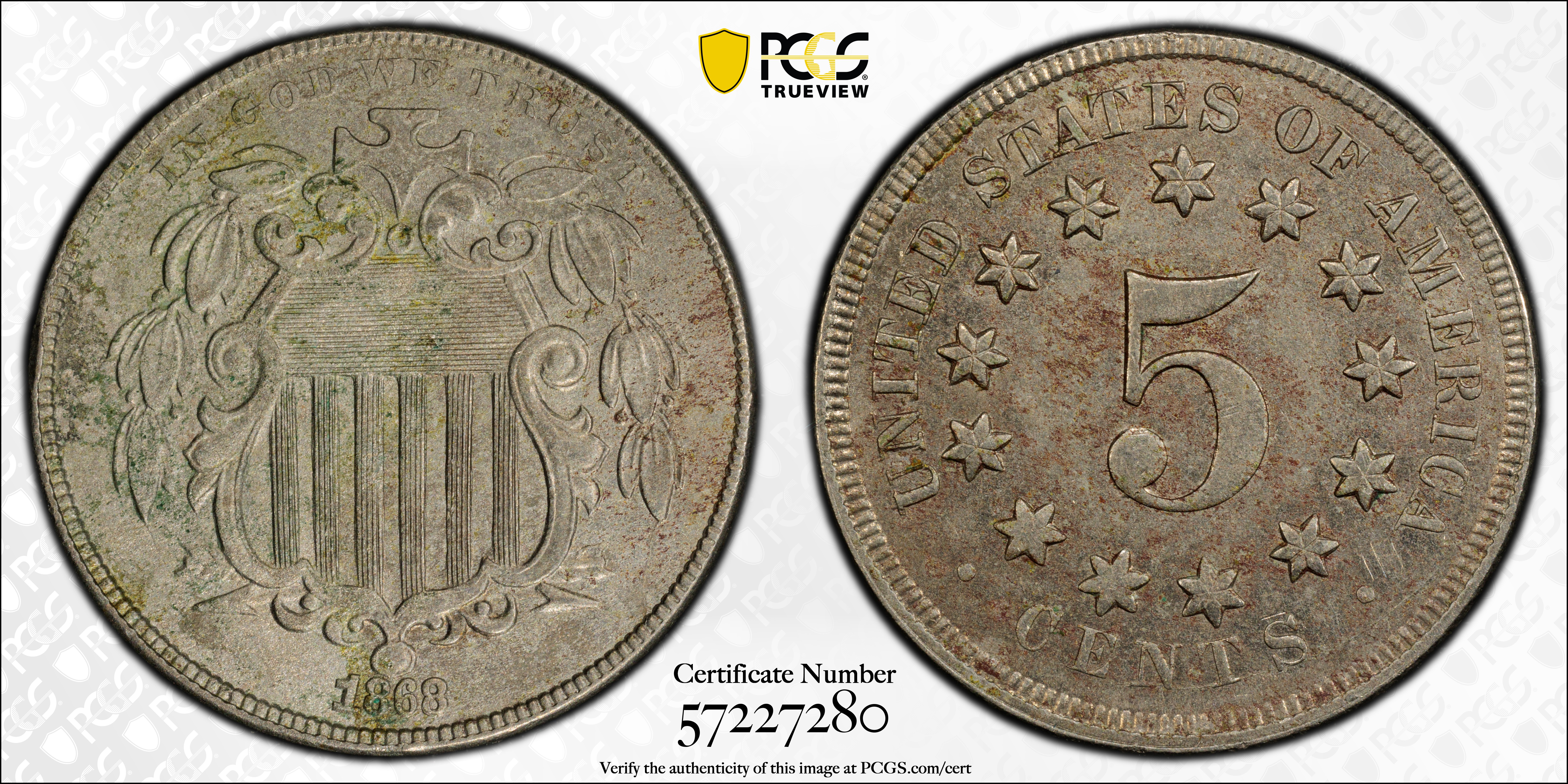 Mint State 1868 Nickels are readily available in grades up through MS65. There are enough MS66 examples to fill the PCGS Condition Census with coins of that grade, but PCGS has not assigned a higher grade to any 1868 Nickel.