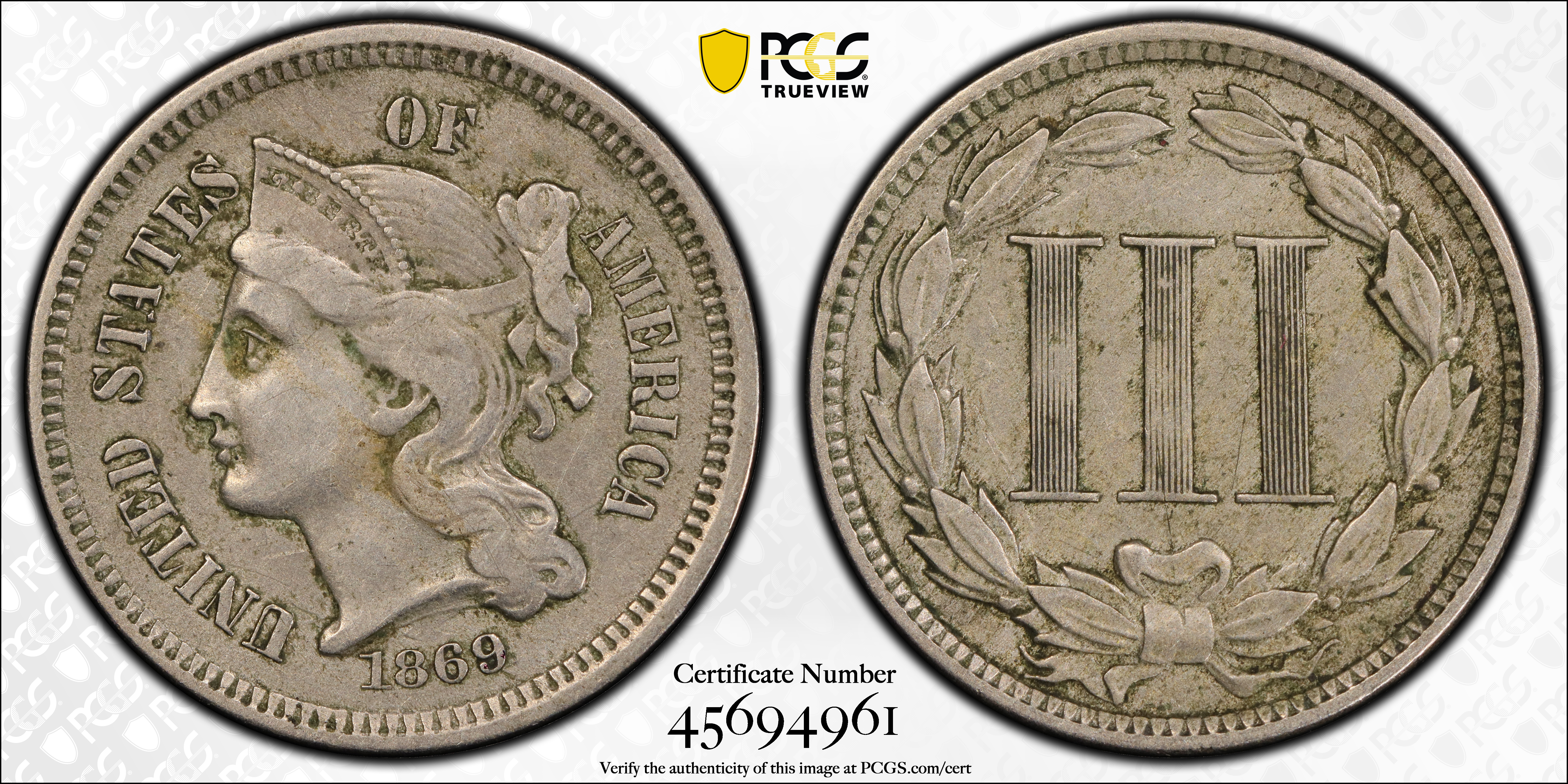 1869 3CN VF35 Certification #45694961, PCGS #3735