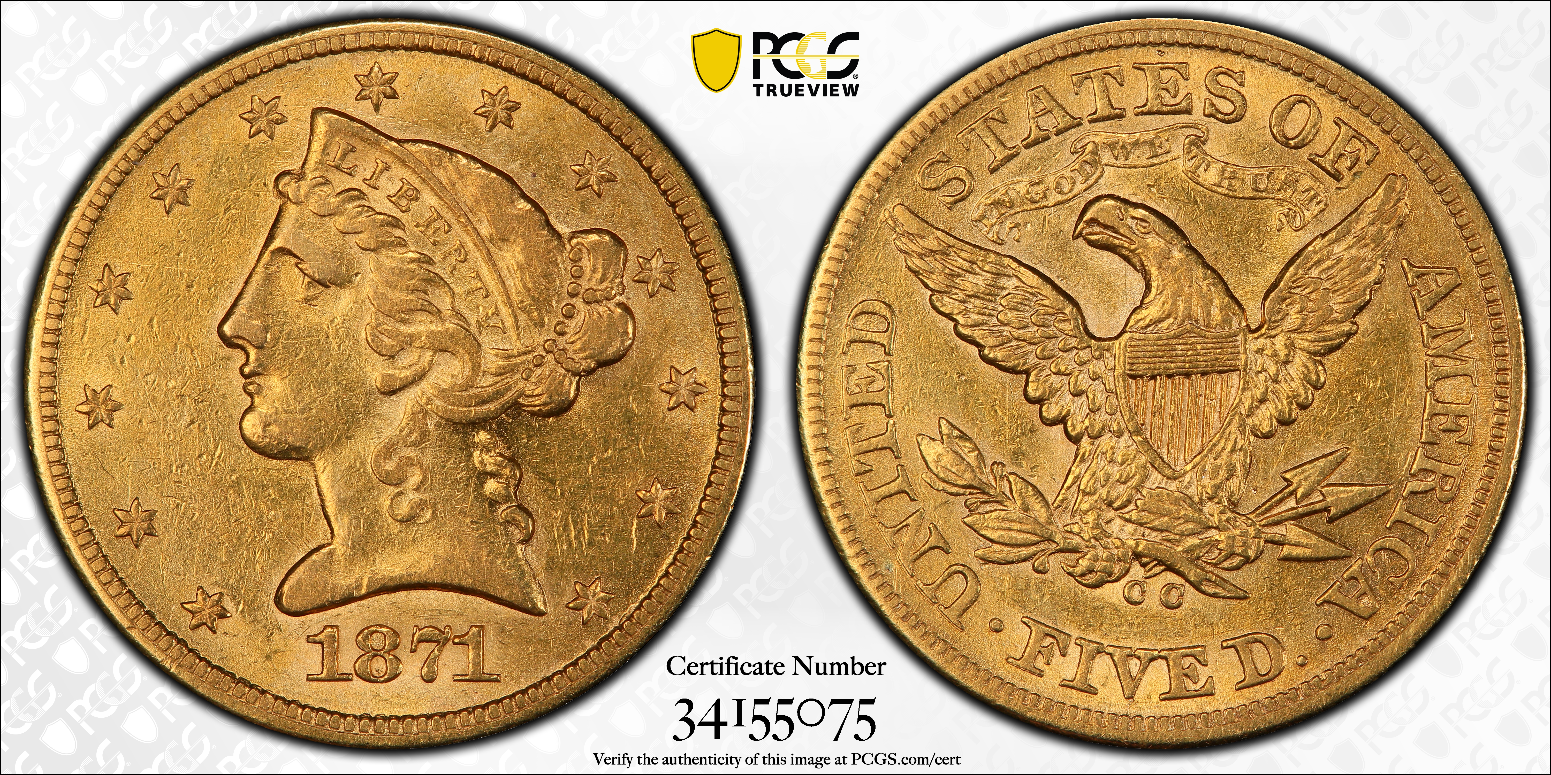 1871-CC $5 AU55 Certification #34155075, PCGS #8323