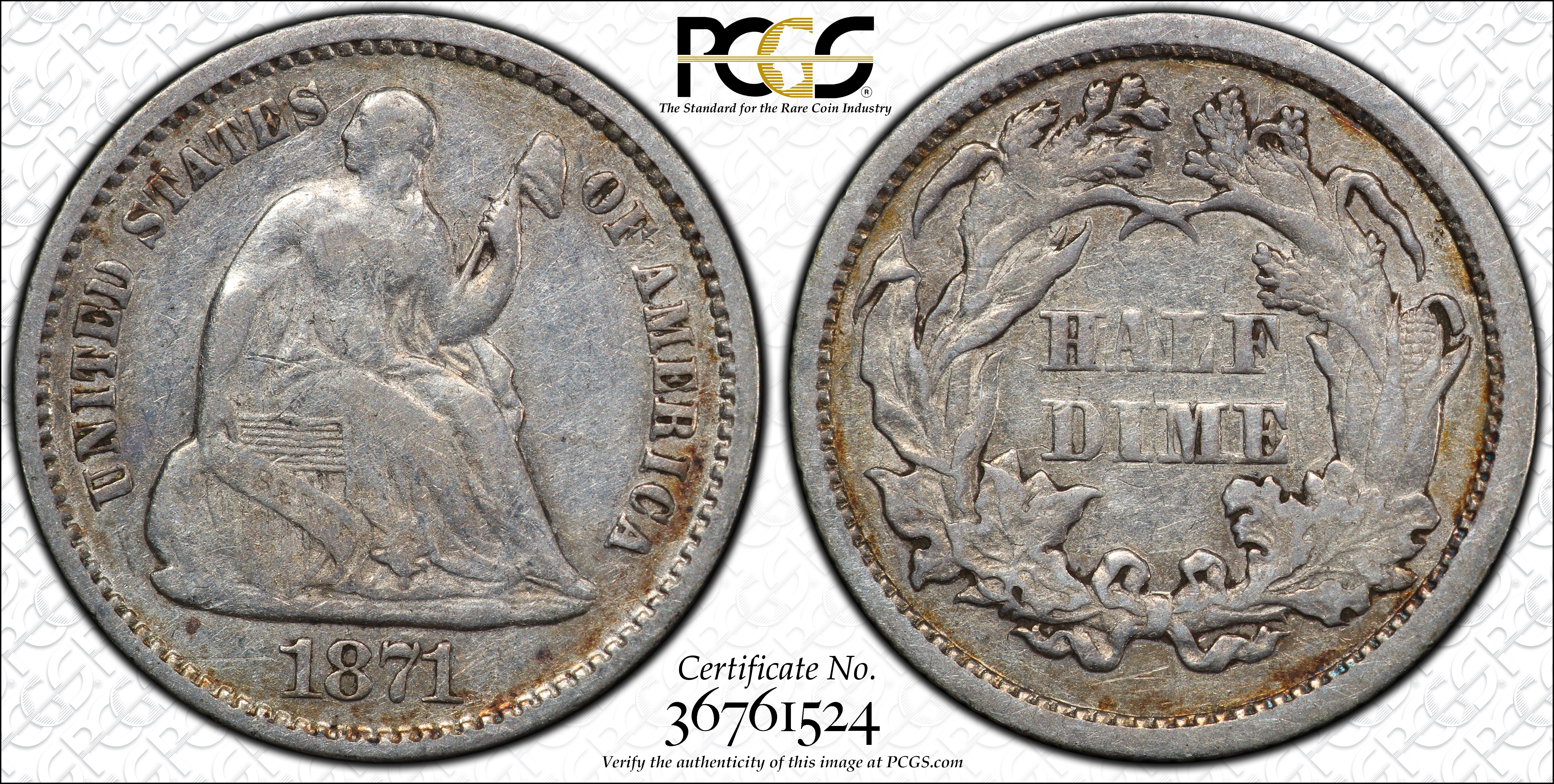 The 1871 Half Dime is one of the most common dates in the series, though it is not as plentiful as dates such as 1837 Large Date, 1853 With Arrows, 1857, 1858, 1860, and 1872-S (Mintmark below wreath). Likewise, Mint State examples are reasonably plentiful, especially in the MS63 and MS64 grades. A dozen or so MS66 examples are known, but PCGS has certified only one MS67 example, with none finer (as of March 2011).