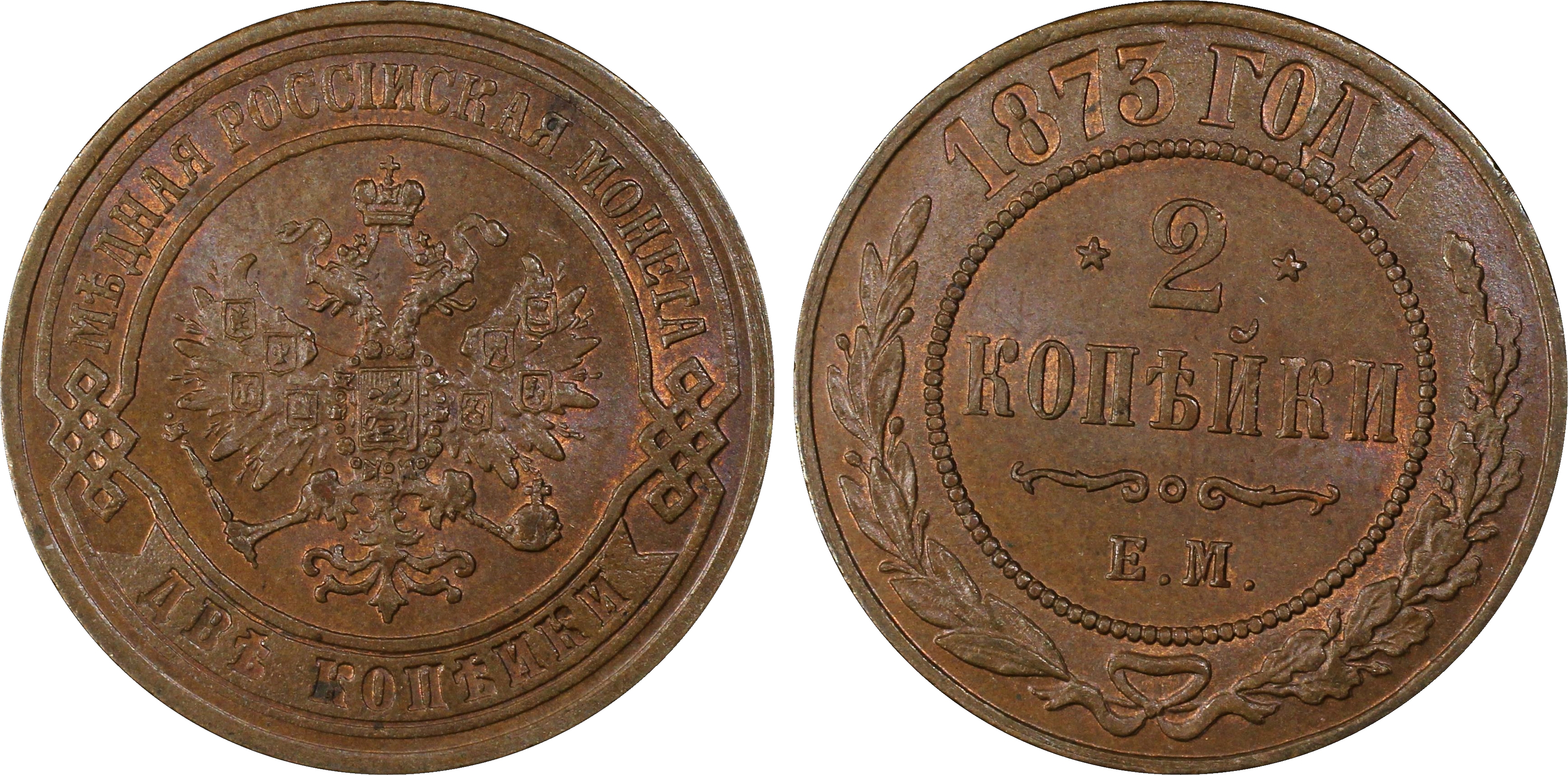 1873 EM 2 Kop Bit-418, BN MS65BN Certification #28571728, PCGS #866761