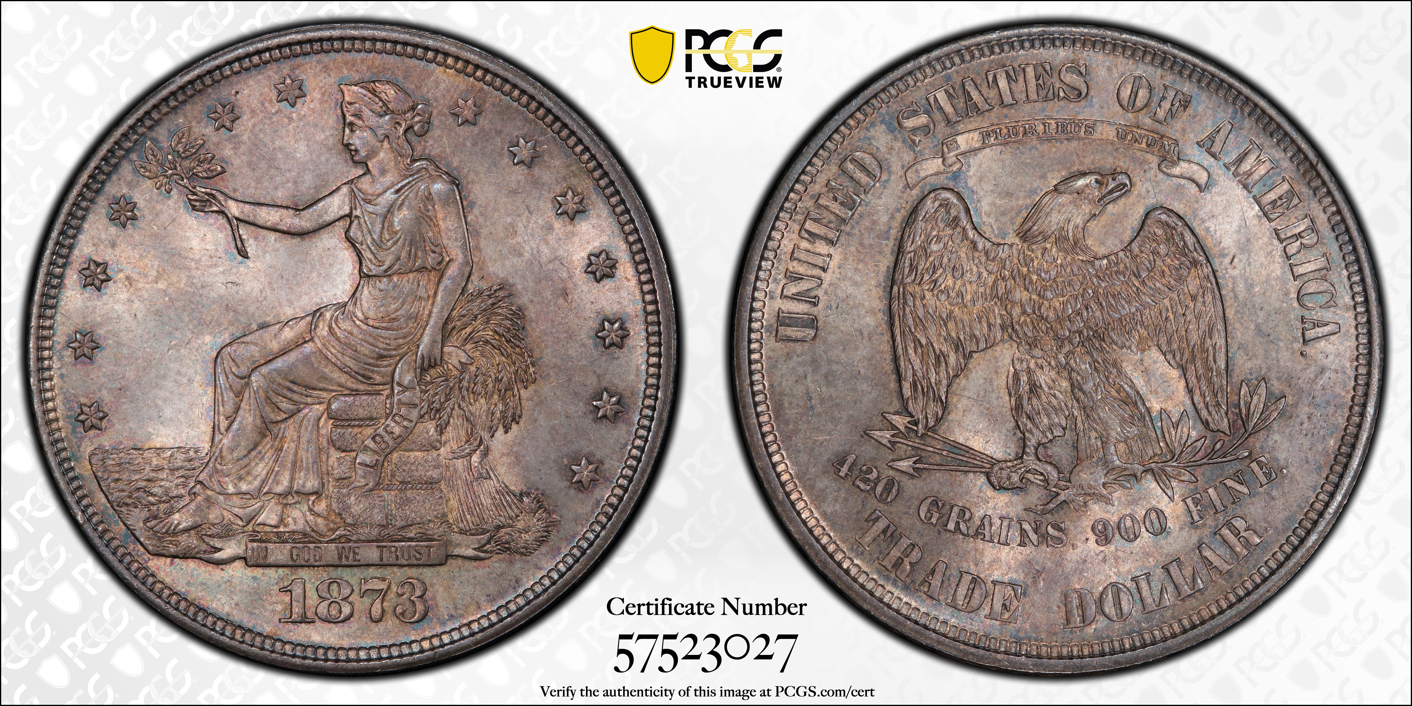 1873 T$1 Trade MS65 Certification #57523027, PCGS #7031