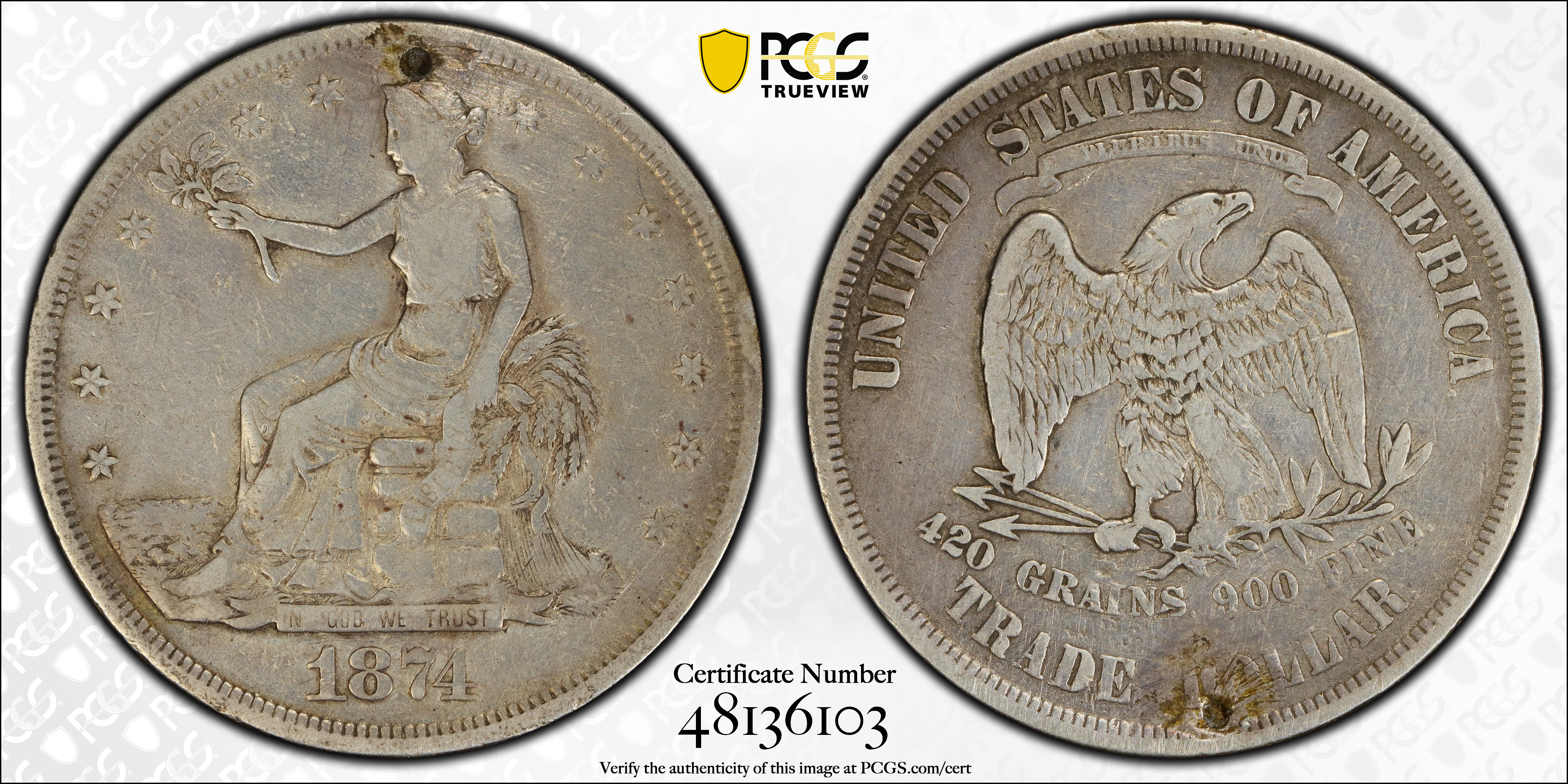 Most were shipped to the China. With chopmarks, the 1874 is the most common Philadelphia Mint trade dollar. Unchopmarked and in Mint State the 1874 is rare.
