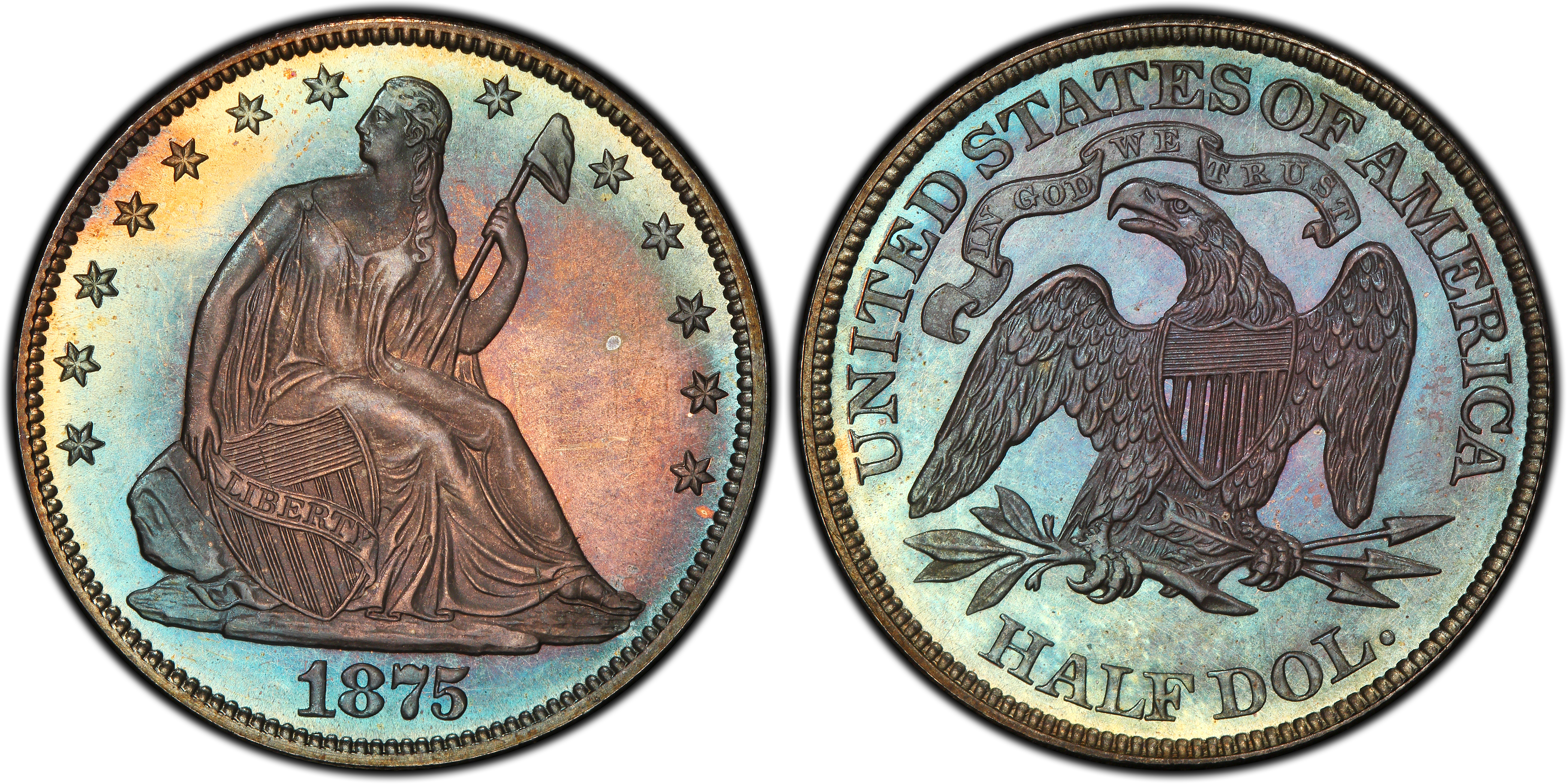 The mintage of 1875 Proof Half Dollars was a mere 700 pieces. However, virtually all of them went to collectors or dealers and most have survived since the time of issue. The level of care given to many of the pieces left something to be desired, thus these often come with hairlines, an occasional contact mark, or they have been mishandled or cleaned. Finding a superb example is a real challenge, as evidenced by the PCGS Population Report, which shows a majority of the census in PR63 and PR64, a dwindling number of PR65's, an even smaller number PR66's, and hardly any PR67's. Fewer than a tenth of the certified examples are Cameos. No Deep Cameos are known.