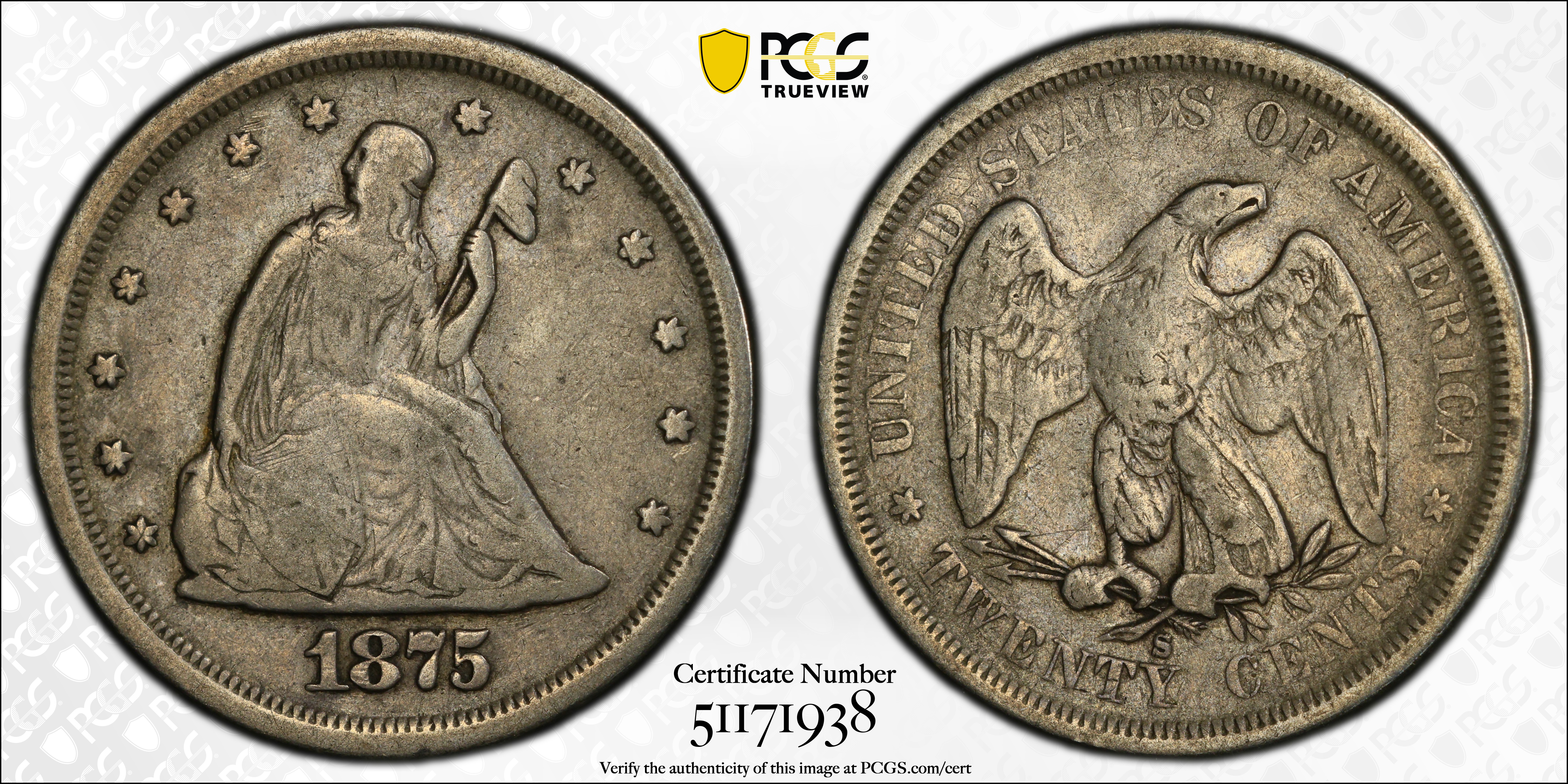 1875-S 20C F12 Certification #51171938, PCGS #5298