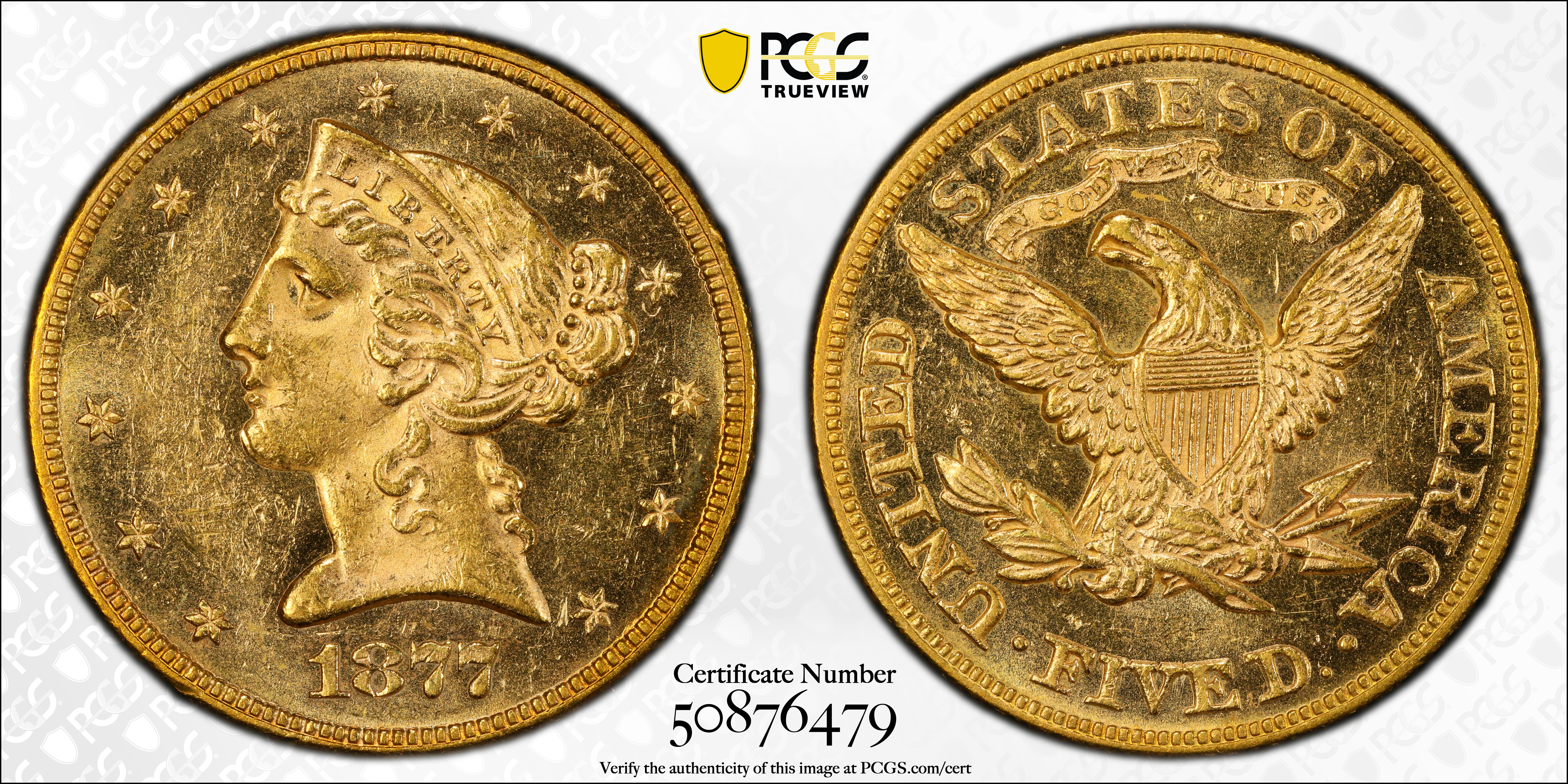 1877 $5, PL MS62PL Certification #50876479, PCGS #88342