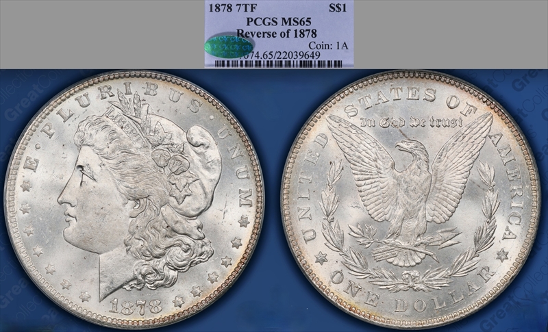 Numismatic status: As of 1992, there is not a widespread interest in collecting 1878 7 tail feathers Morgan dollars by reverse varieties, although there is no reason why there shouldn't be. At present, many dealers do not differentiate the varieties when offering 1878 7 tail feathers dollars for sale, although the leading certification services identify them. I believe that when the new 3rd edition of the Van Allen-Mallis work (released in September 1992), achieves widespread distribution, interest in varieties of 1878 dollars will increase dramatically.
