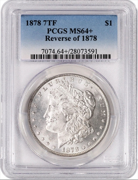 Mint State grades (Second Reverse): Most Mint State 1878 7 TF dollars are of the Second Reverse variety. Specimens are plentiful up to and including MS-64. Coins at the MS-65 level are elusive. My estimates are as fol1ows: MS-60 to 62,50,000 to 100,000; MS-63, 45,000 to 90,000; MS-64, 15,000 to 30,000; and MS-65 or higher, only 1,000 to 2,000.
