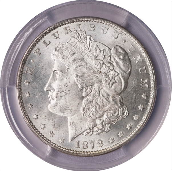 The 1878 7 tail feather flat breast [Second Reverse] dollar is usually adequately struck. However, because the breast of the eagle, by design, is flat and concave, the reverse may appear at first glance to be poorly struck. The typical specimen has poor lustre, but some pieces exhibit superb frosty surfaces, especially on the reverse. Bagmarks are much more prominent than usual and are the primary deterrent in locating a gem. This date is usually underrated In gem condition.