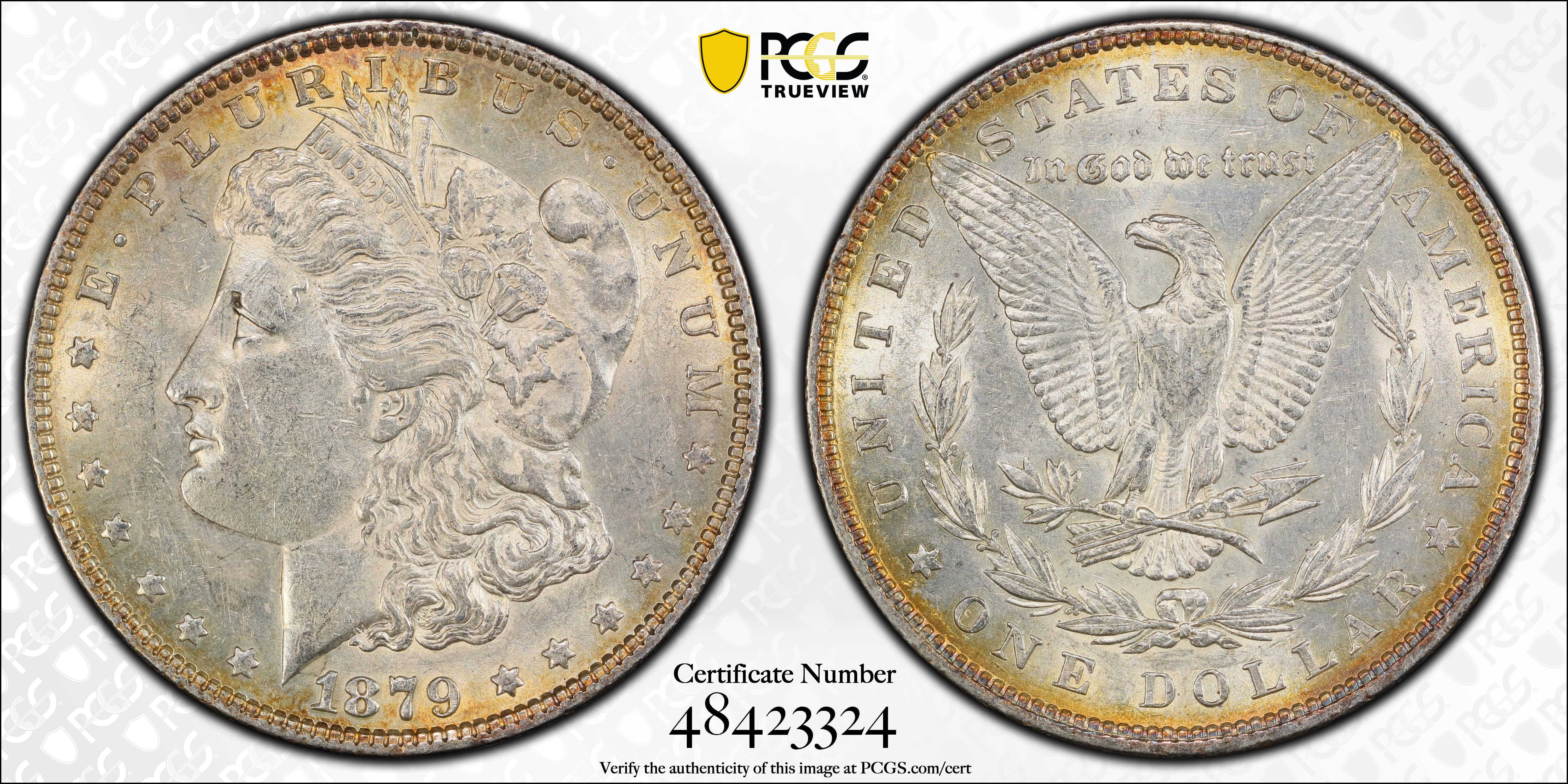 In 1879, the U.S, Mint at Philadelphia made three different Dollar coins: Morgan Dollars; Trade Dollars (Proof-only); and Gold Dollars. Among the Morgan Dollars, the 1879 is popular because it is easy to obtain in all grades, including Gem condition. This date even shows up in MS67, though very infrequently.