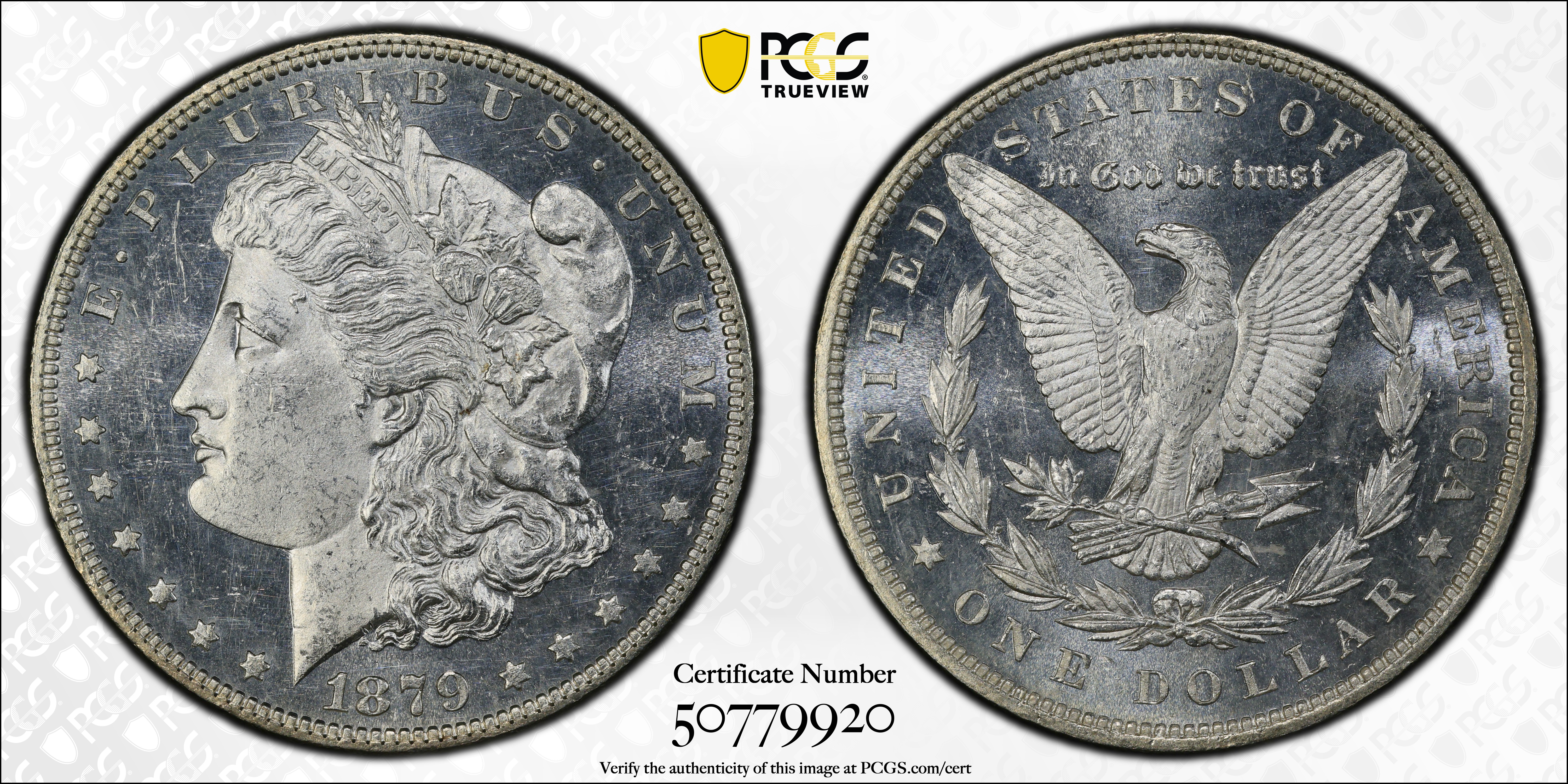 In 1879, the U.S, Mint at Philadelphia made three different Dollar coins: Morgan Dollars; Trade Dollars (Proof-only); and Gold Dollars. Among the Morgan Dollars, the 1879 is popular because it is easy to obtain in all grades, including Gem condition. This date even shows up in MS67, though very infrequently.