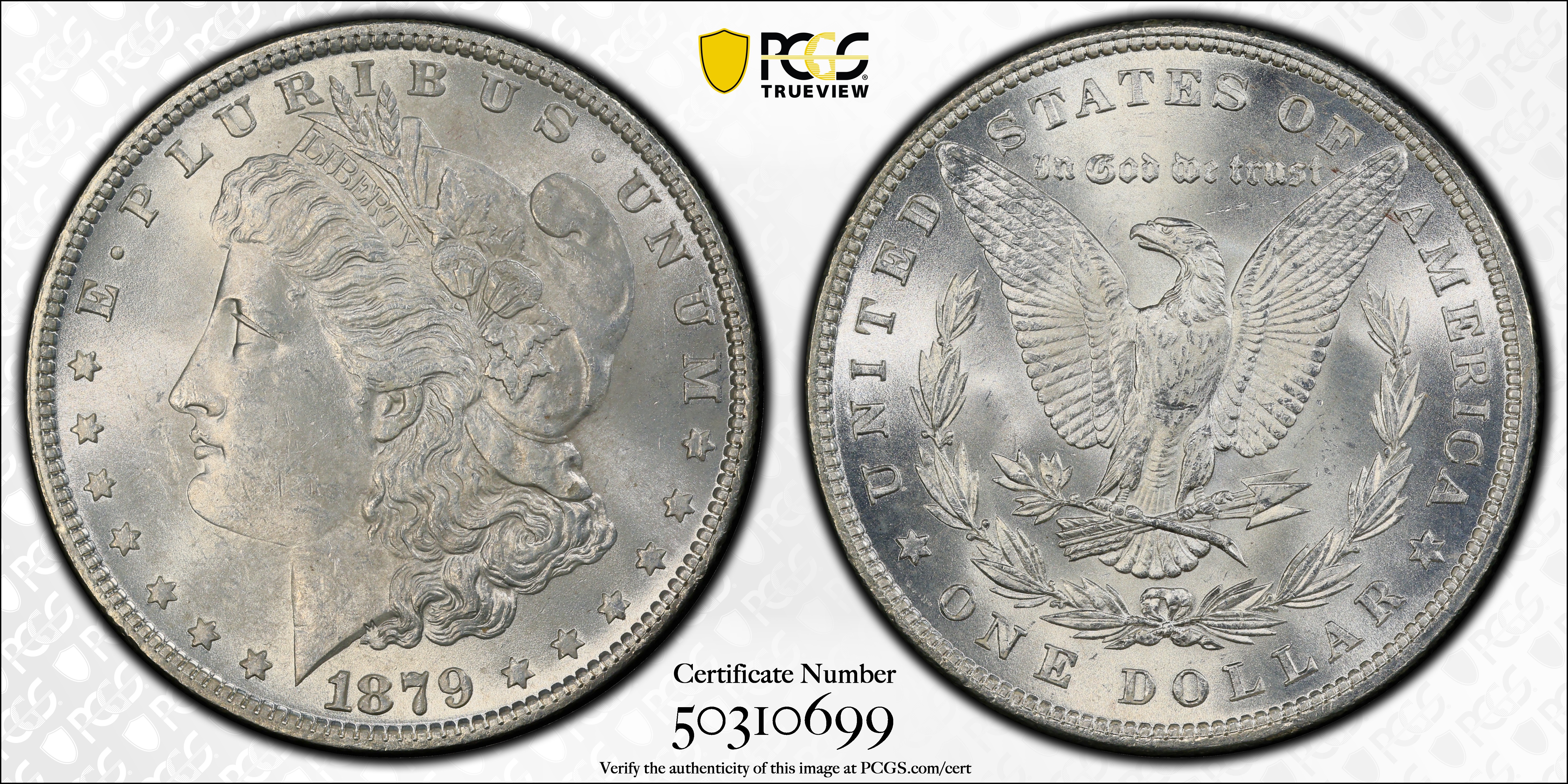 In 1879, the U.S, Mint at Philadelphia made three different Dollar coins: Morgan Dollars; Trade Dollars (Proof-only); and Gold Dollars. Among the Morgan Dollars, the 1879 is popular because it is easy to obtain in all grades, including Gem condition. This date even shows up in MS67, though very infrequently.