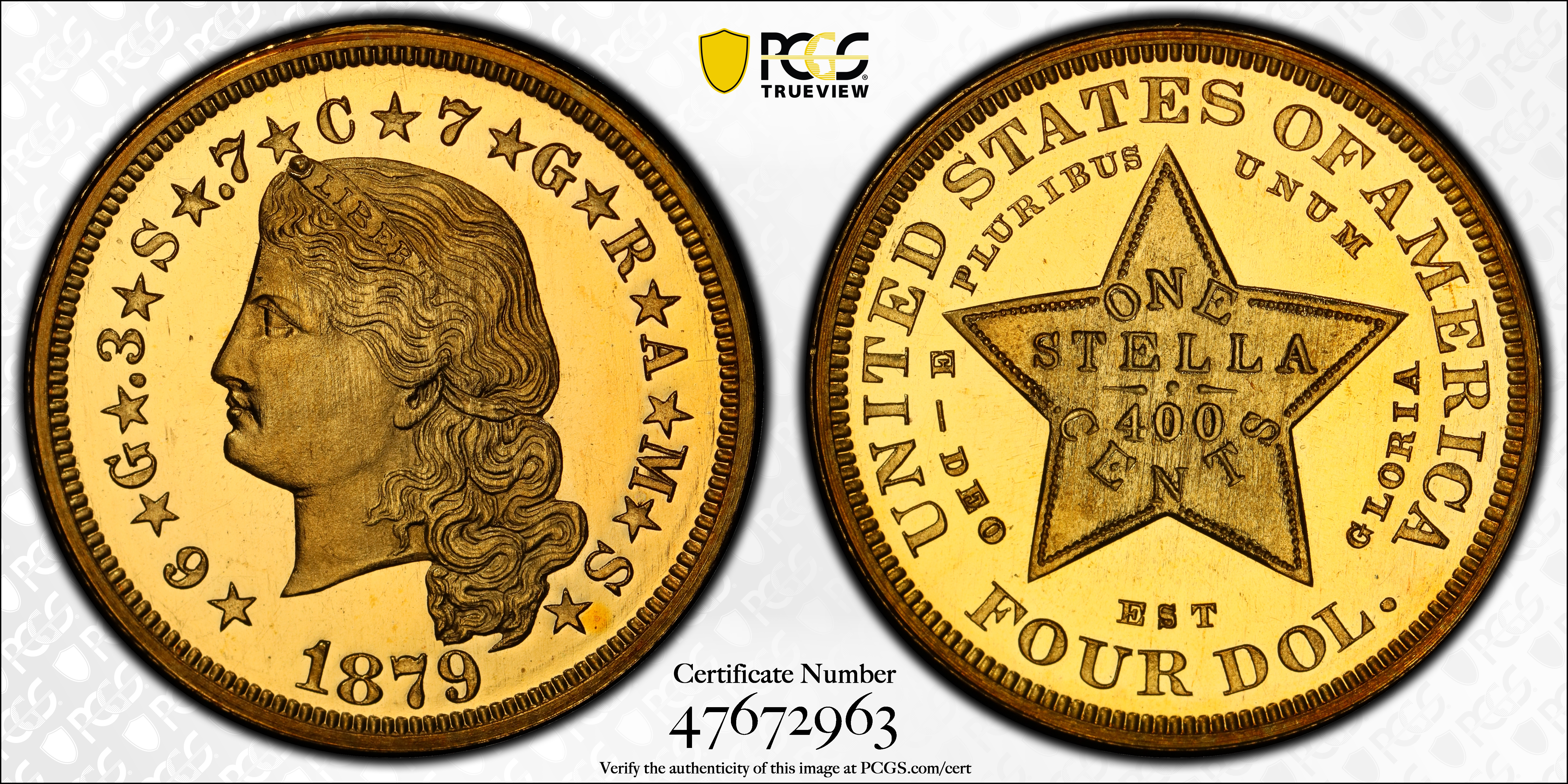 1879 $4 Flowing Hair, DCAM PR66DCAM Certification #47672963, PCGS #98057
