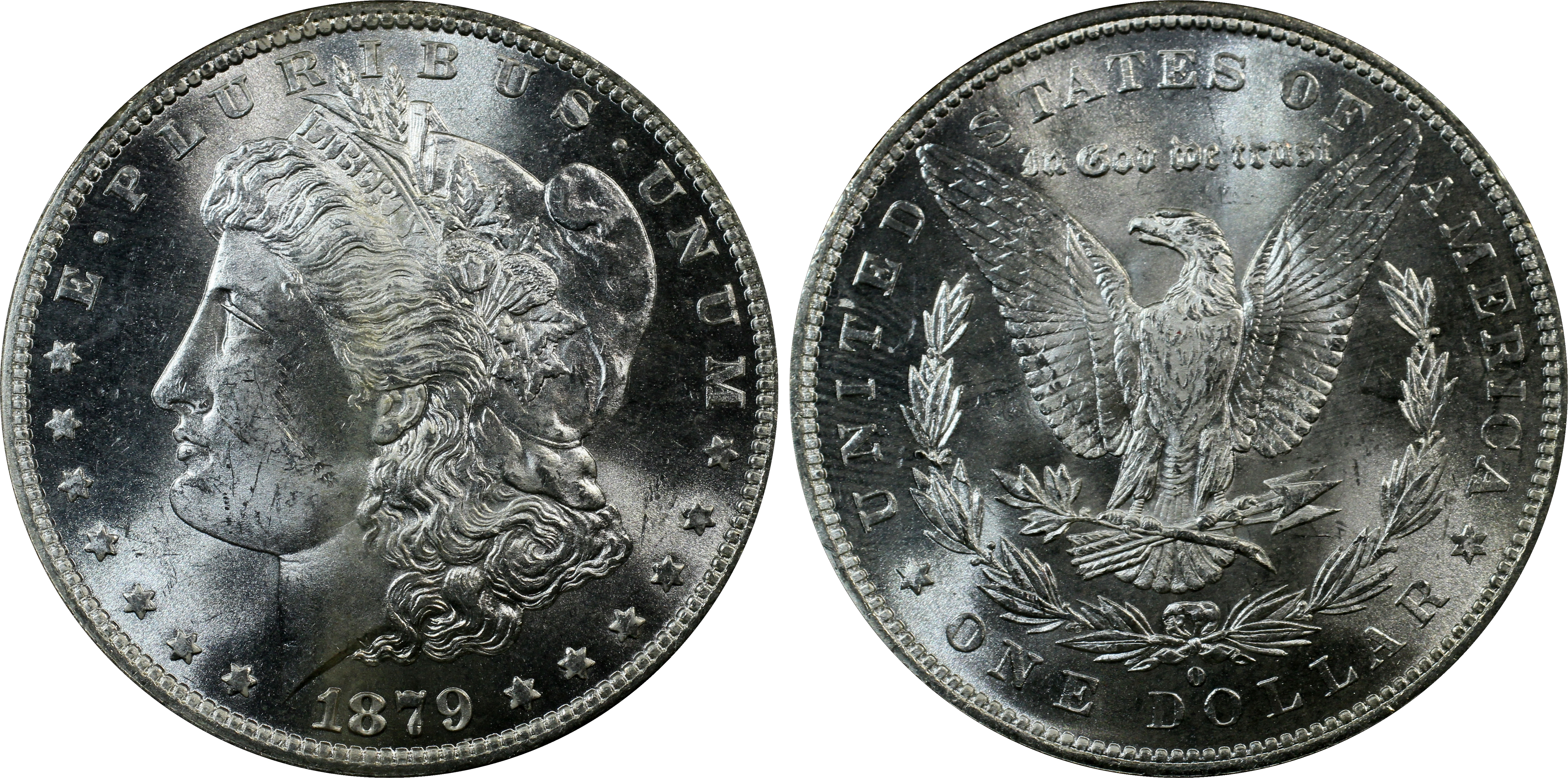 The 1879-O is very common in AU condition. The reason is that the 1879-O, like the 1880-O, 1881-O, and 1882-O, was released' into circulation in the New Orleans area in large quantities soon after striking. For reasons which have never been explained, these dollars were then gathered up after they had been lightly circulated, brought back to the Mint, and resealed into Mint bags. Mint sealed bags of these dates often contain over 90% lightly circulated pieces, including a few dollars from the Philadelphia, San Francisco, and Carson City mints, which happened to be circulating in the New Orleans area at the time of recall. Because of the preponderance of AU 1879-O dollars, always examine them carefully. Check the breast feathers for wear.