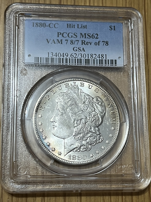 1880-CC $1 VAM 7 8/7 Rev of 78 Hit List MS62 Certification #30182481, PCGS #134049