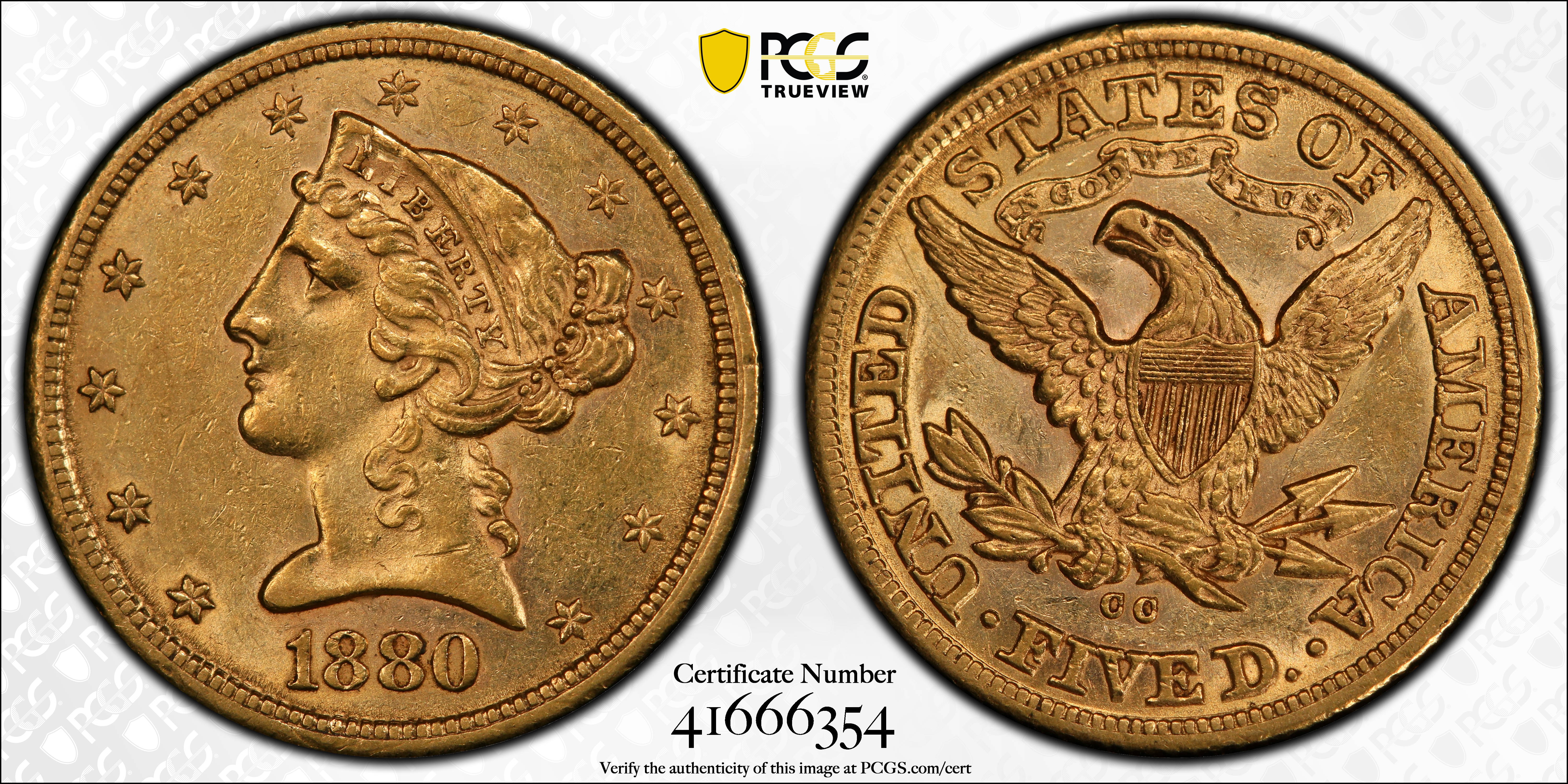 1880-CC $5 AU55 Certification #41666354, PCGS #8352
