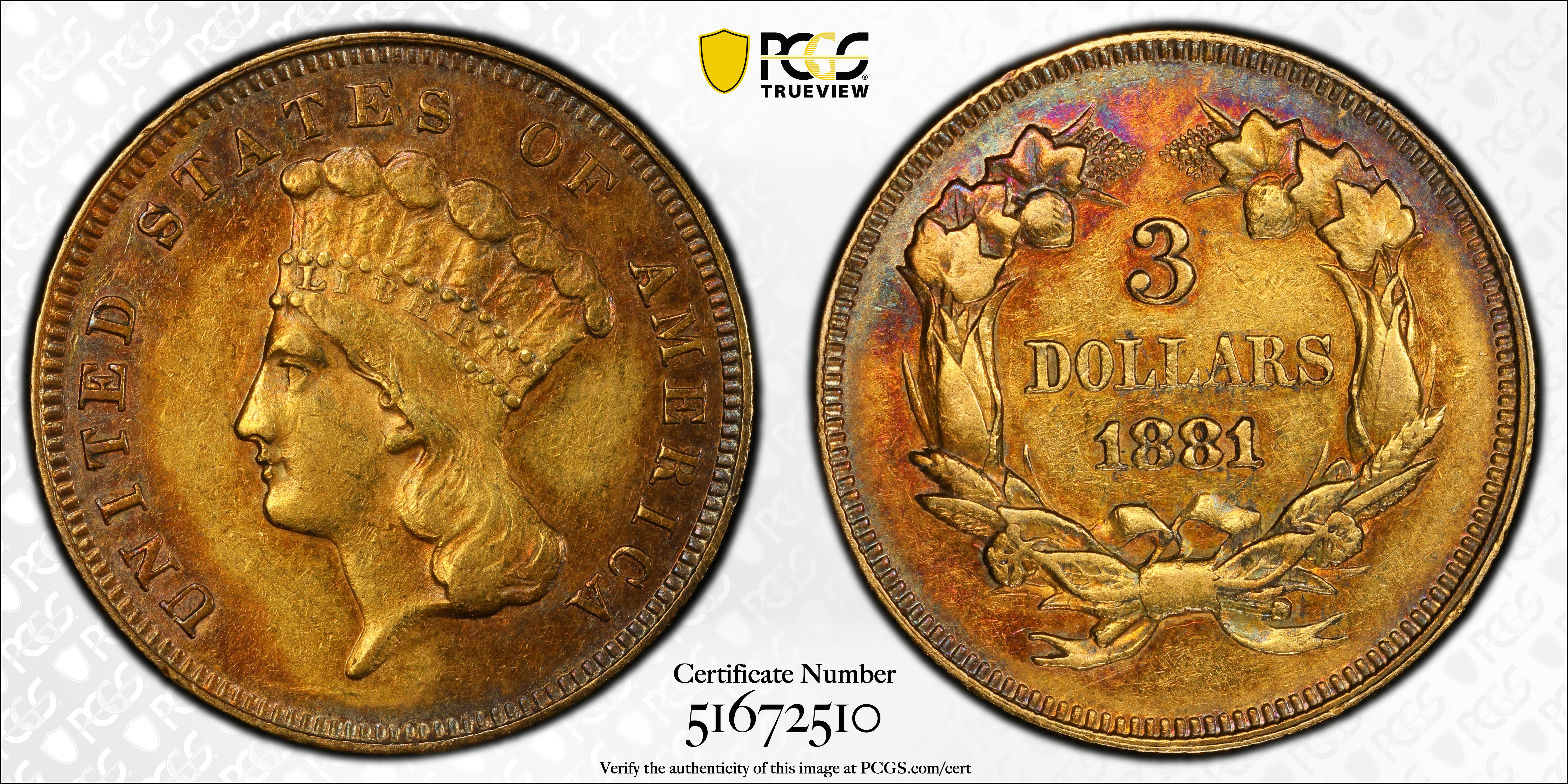 1881 $3 XF45 Certification #51672510, PCGS #8003