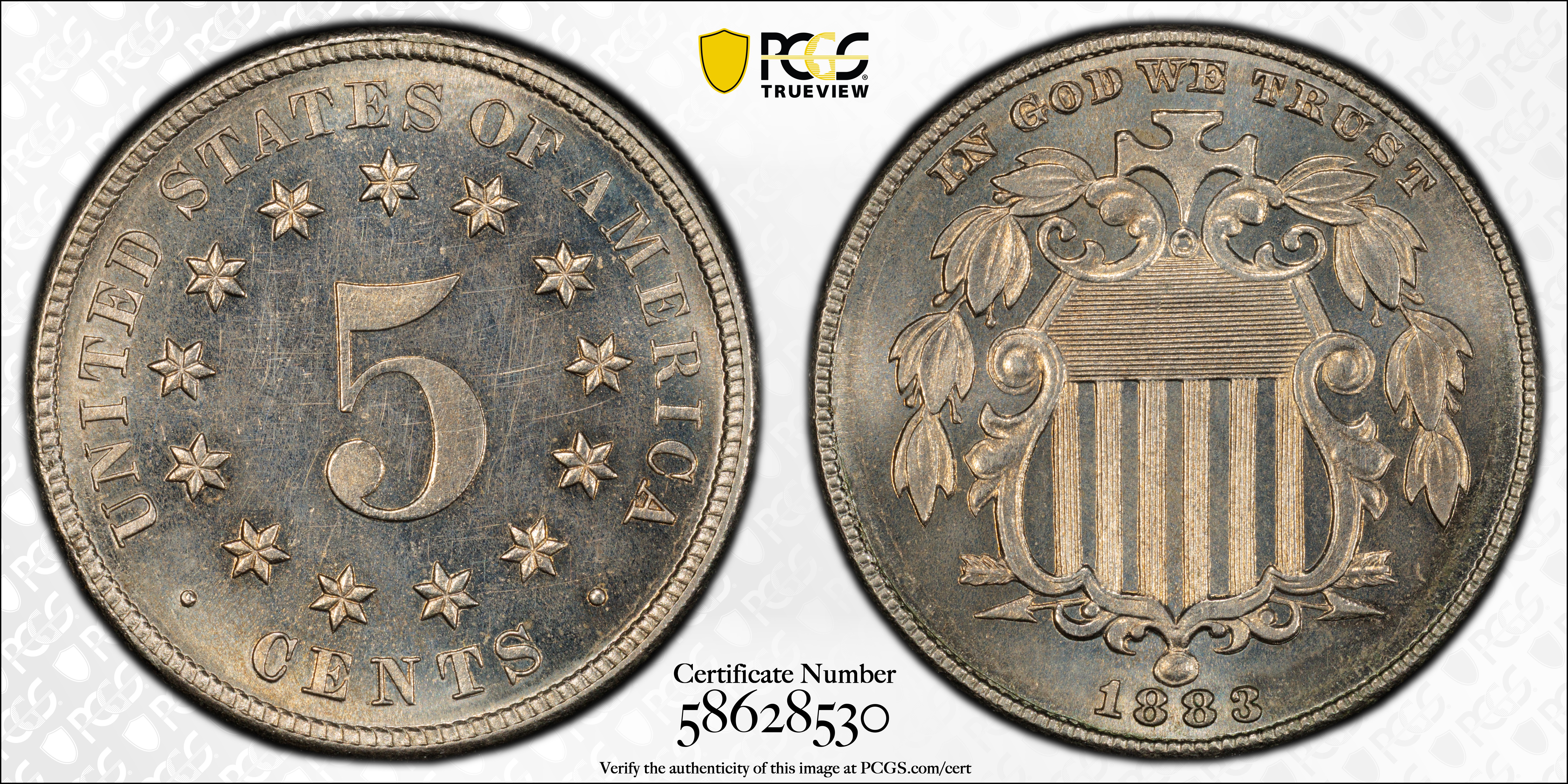 1883 5C Shield PR64 Certification #58628530, PCGS #3838