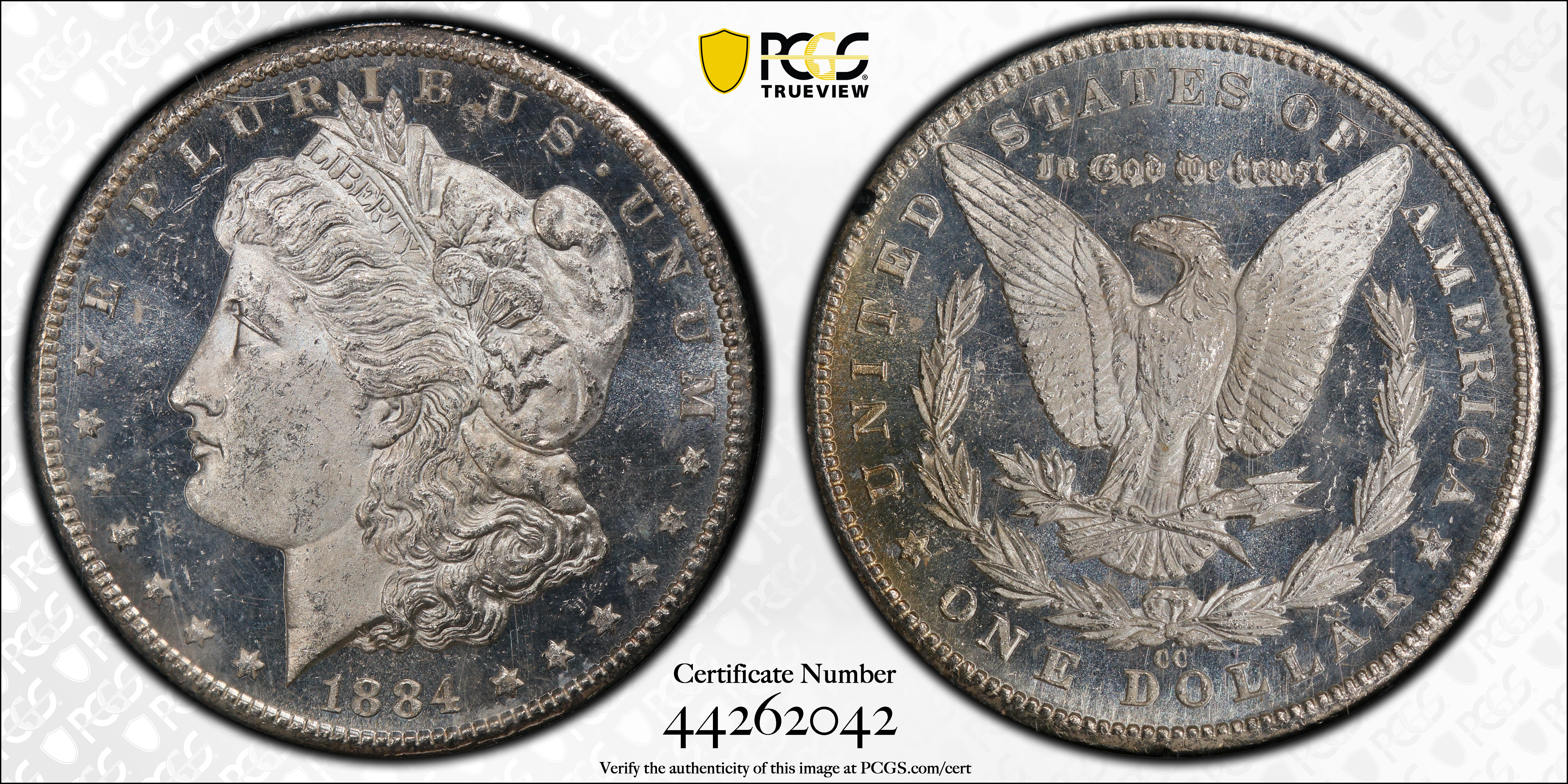 1884-CC $1 GSA Hoard, DMPL MS63DMPL Certification #44262042, PCGS #518874