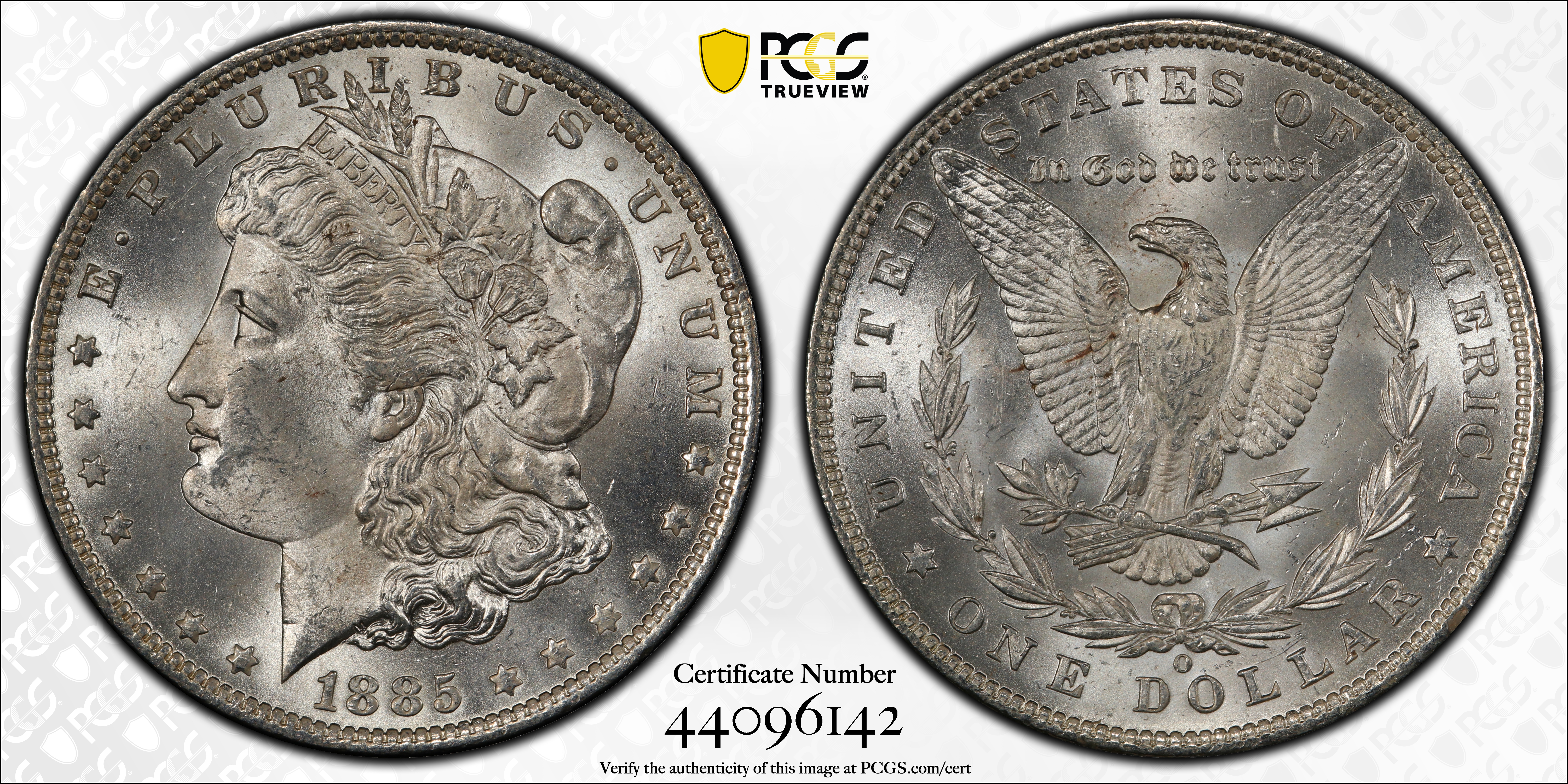 1885-O $1 MS64 Certification #44096142, PCGS #7162