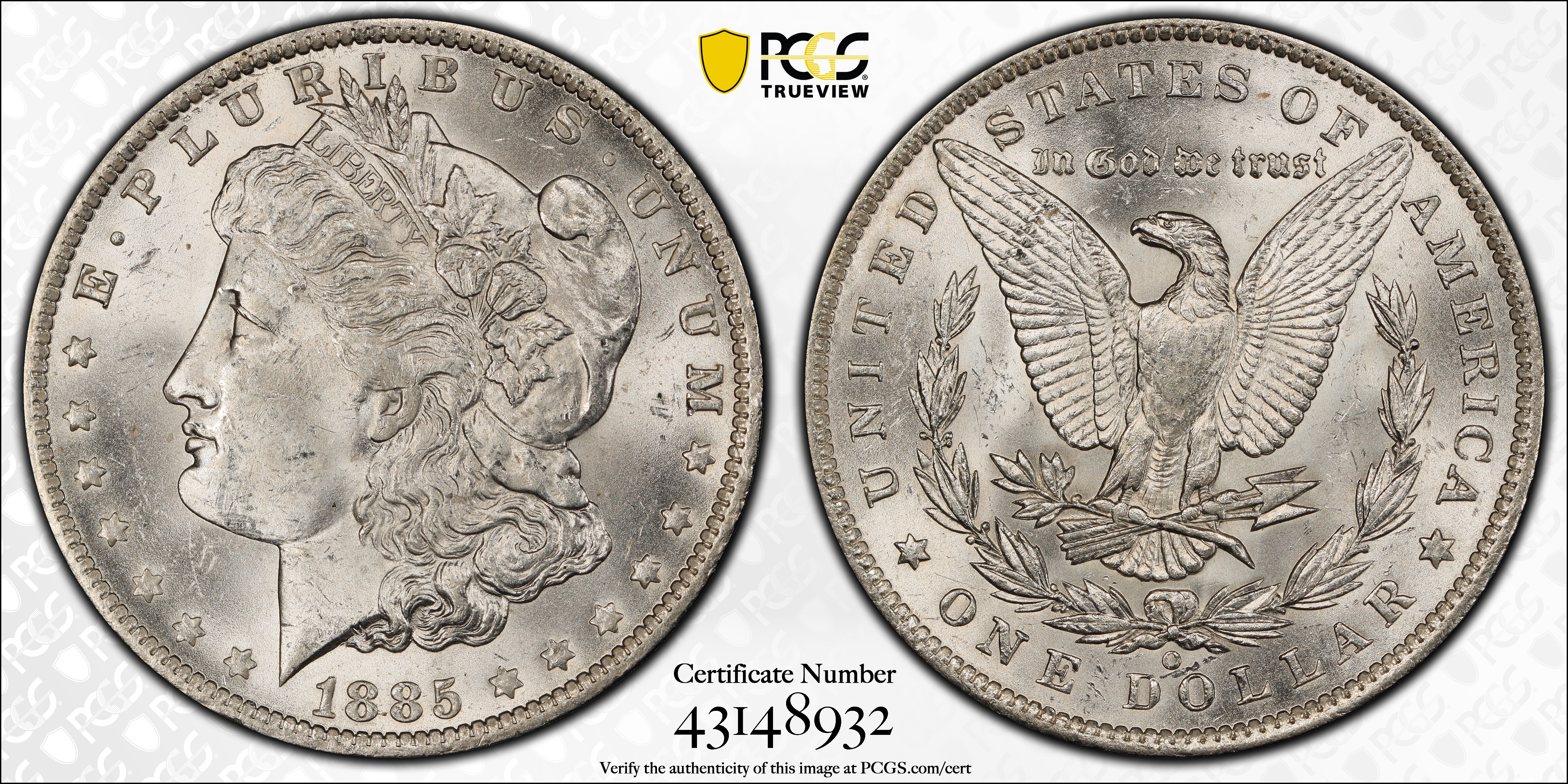 1885-O $1 MS63 Certification #43148932, PCGS #7162