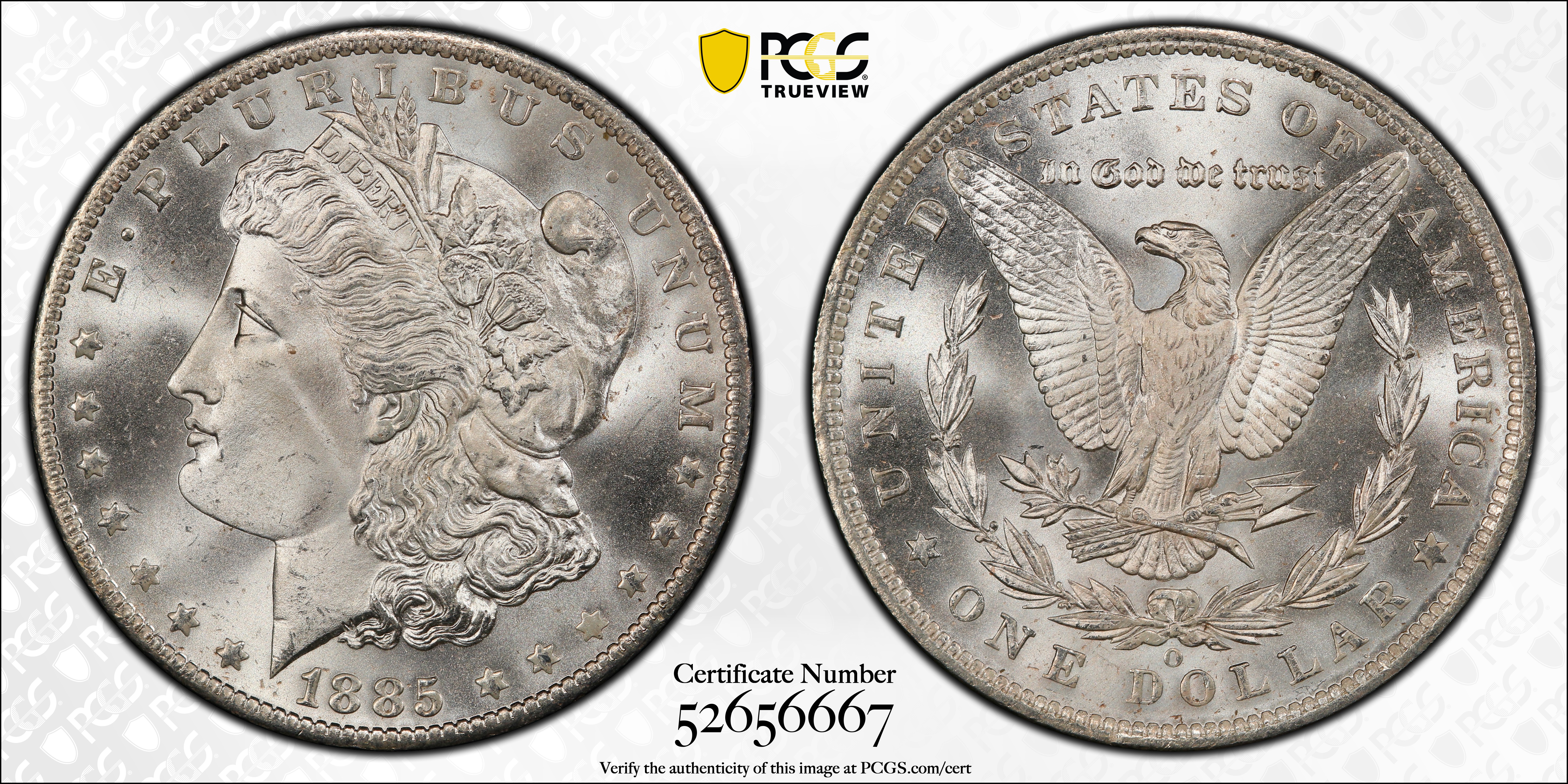 1885-O $1 MS67 Certification #52656667, PCGS #7162