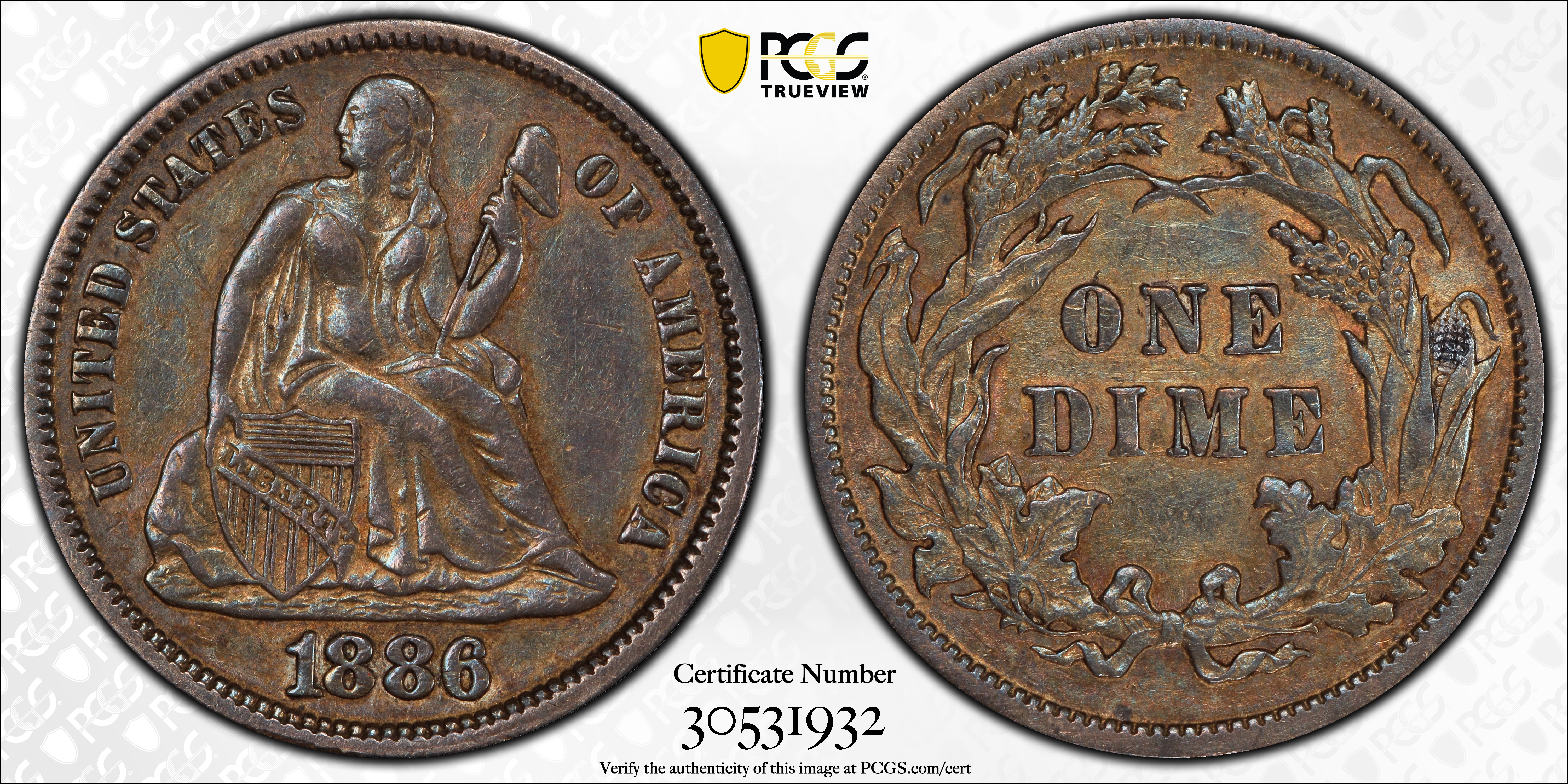 1886 10C AU53 Certification #30531932, PCGS #4696