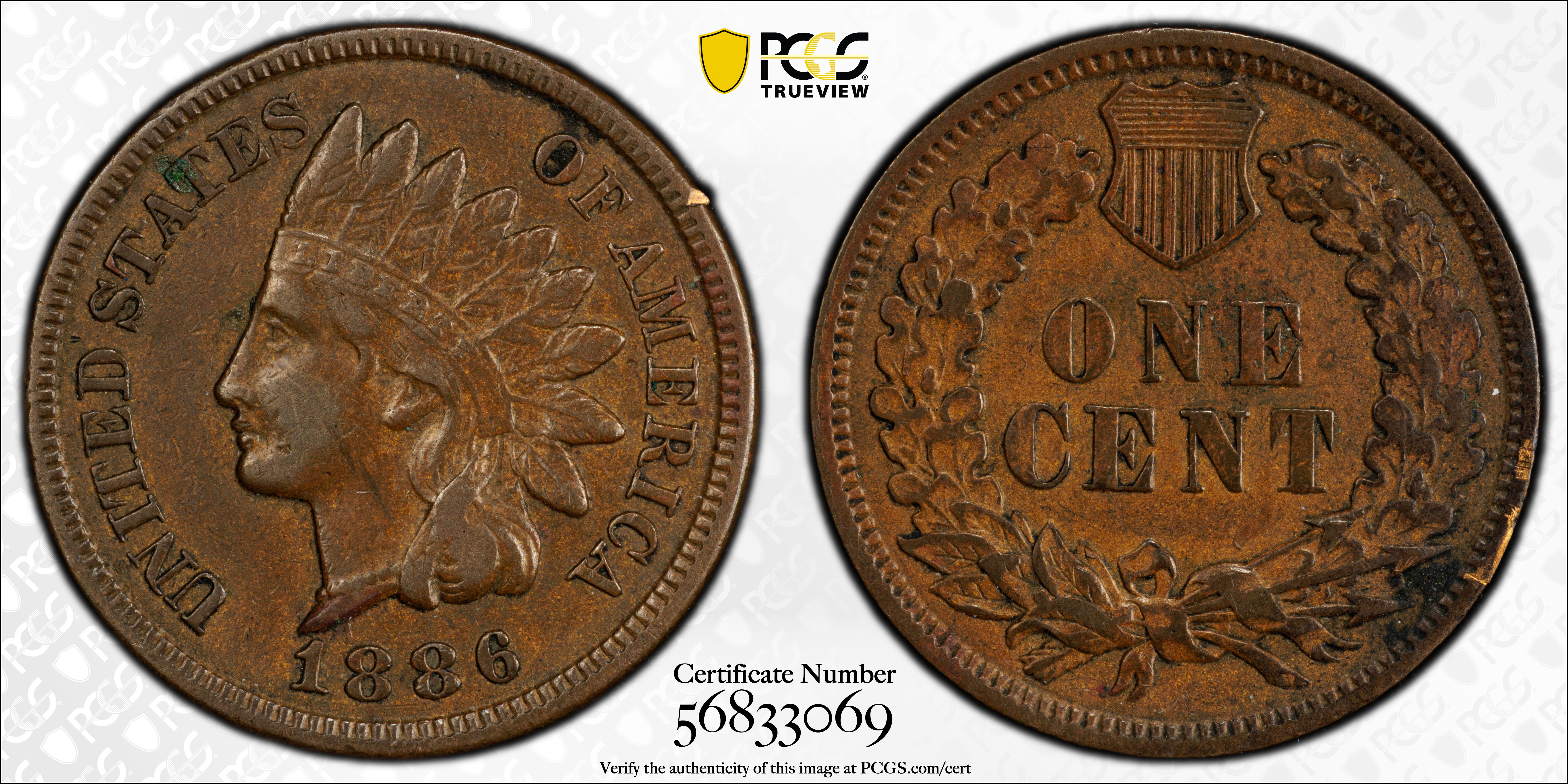The 1886 Indian Head Cent is a very common coin in most grades, but collectors have the opportunity to choose between two major varieties. On Variety 1, the lowest feather of the Indian's headdress points to the IC of AMERICA. On Variety 2, the same feather points to the CA of AMERICA. Variety 1 is slightly more common than Variety 2, but not by much. The same is true of all of the designations: Brown, Red-Brown, and Red. In terms of Mint State grades, both varieties can be found with relative ease in grades up to MS-64. The Red-Brown designation is the most dominant one for both varieties. Red examples appear to be roughly five times more rare then Red-Browns. The best examples certified by PCGS top out at MS66RD.