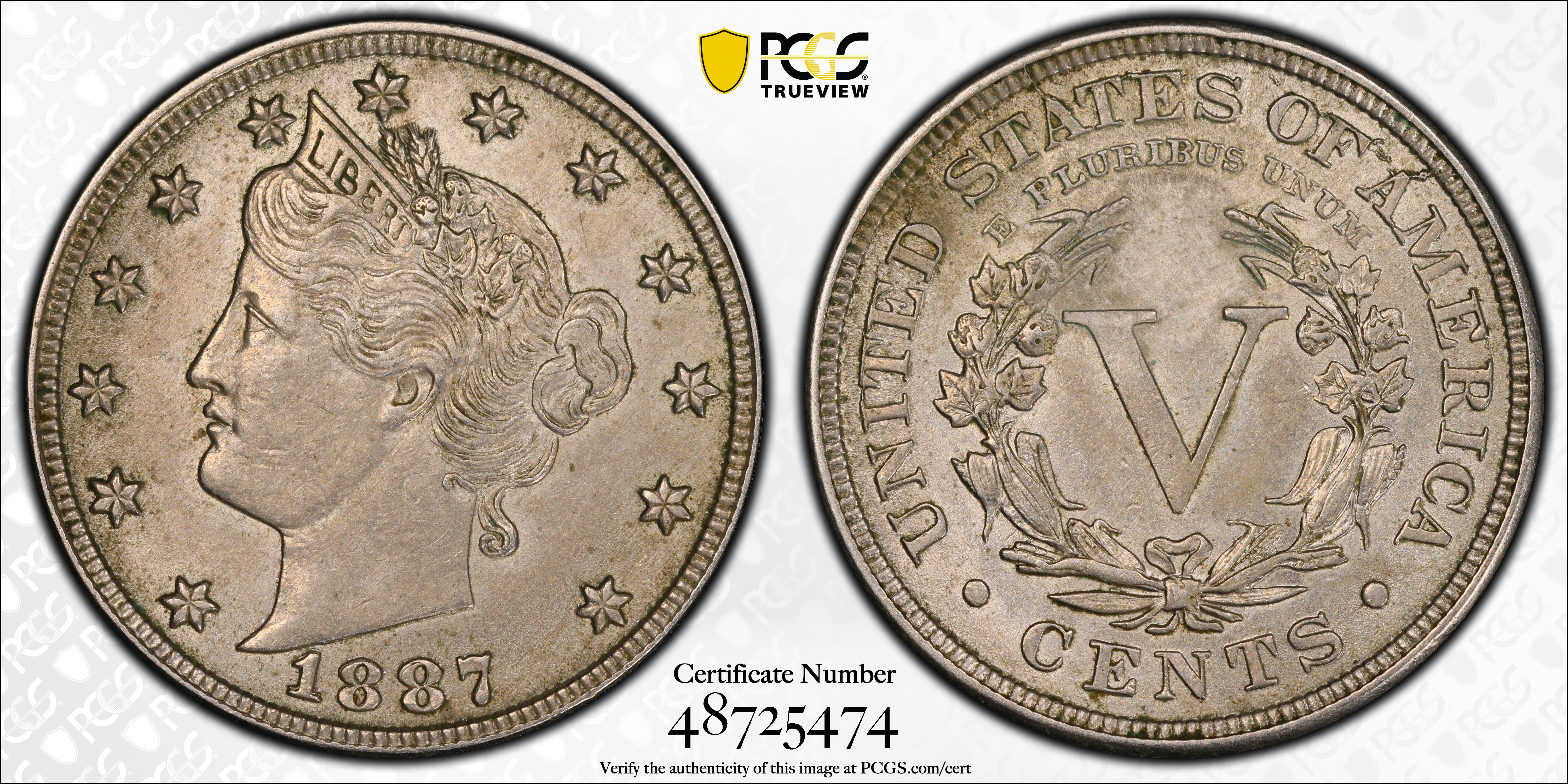 In 1887, the Mint produced over 15 million Liberty Head Nickels, reaching the third highest level to date. As a result, the 1887 Nickel is a very common coin in all grades. Hundreds of certified examples exist in each of the MS63, MS64, and MS65 grades. PCGS has certified less than two dozen MS66s, plus a single PCGS MS66+ (illustrated above), and none finer.
