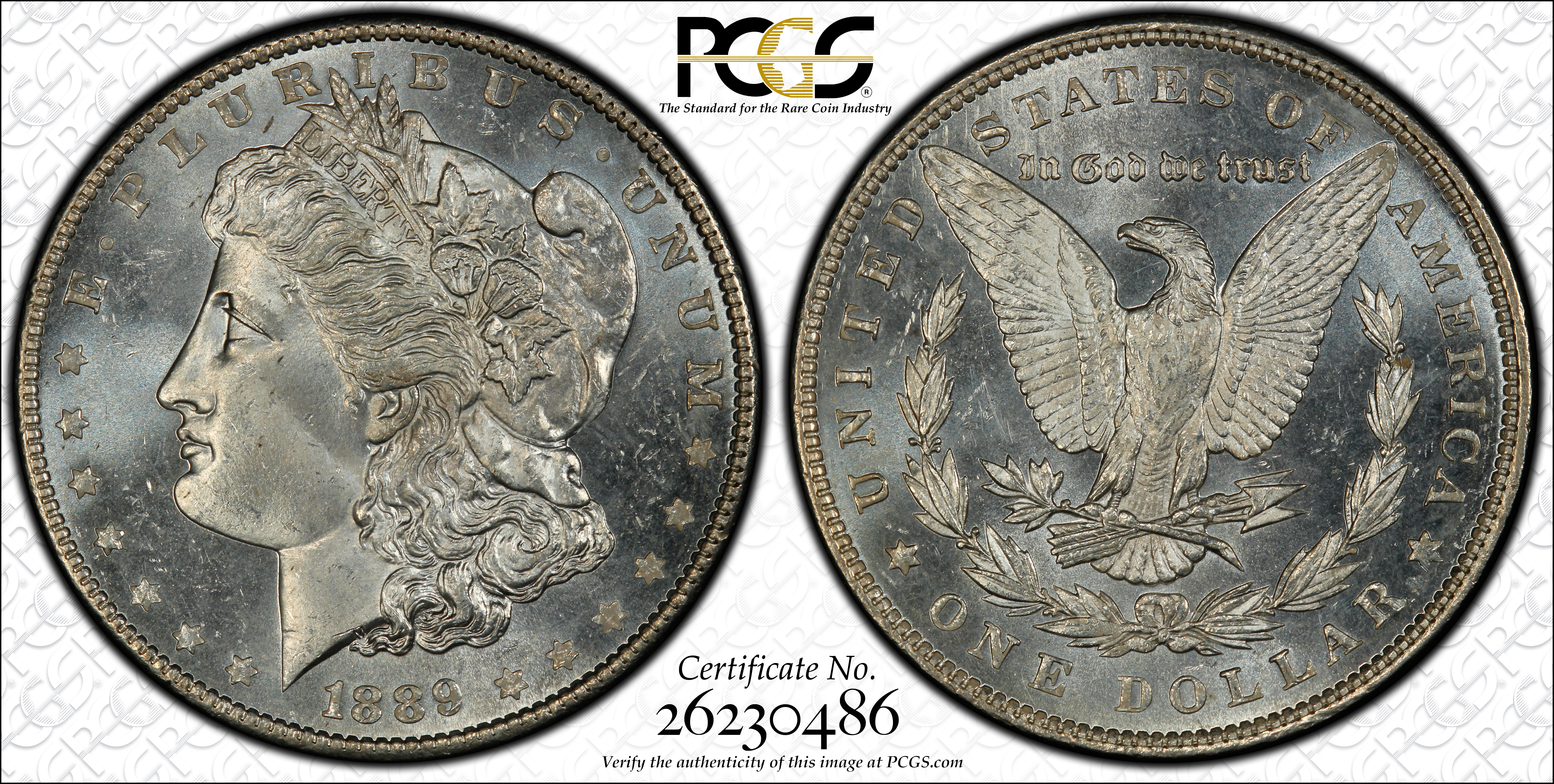 The 1889 Silver Dollar is a very common coin, with literally tens of thousands of certified Mint State examples available. Thousands of MS65 examples have been certified by PCGS, as have hundreds of MS66 and better examples. Where this date gets really rare is at the MS67 level. The finest example is a single PCGS MS68.