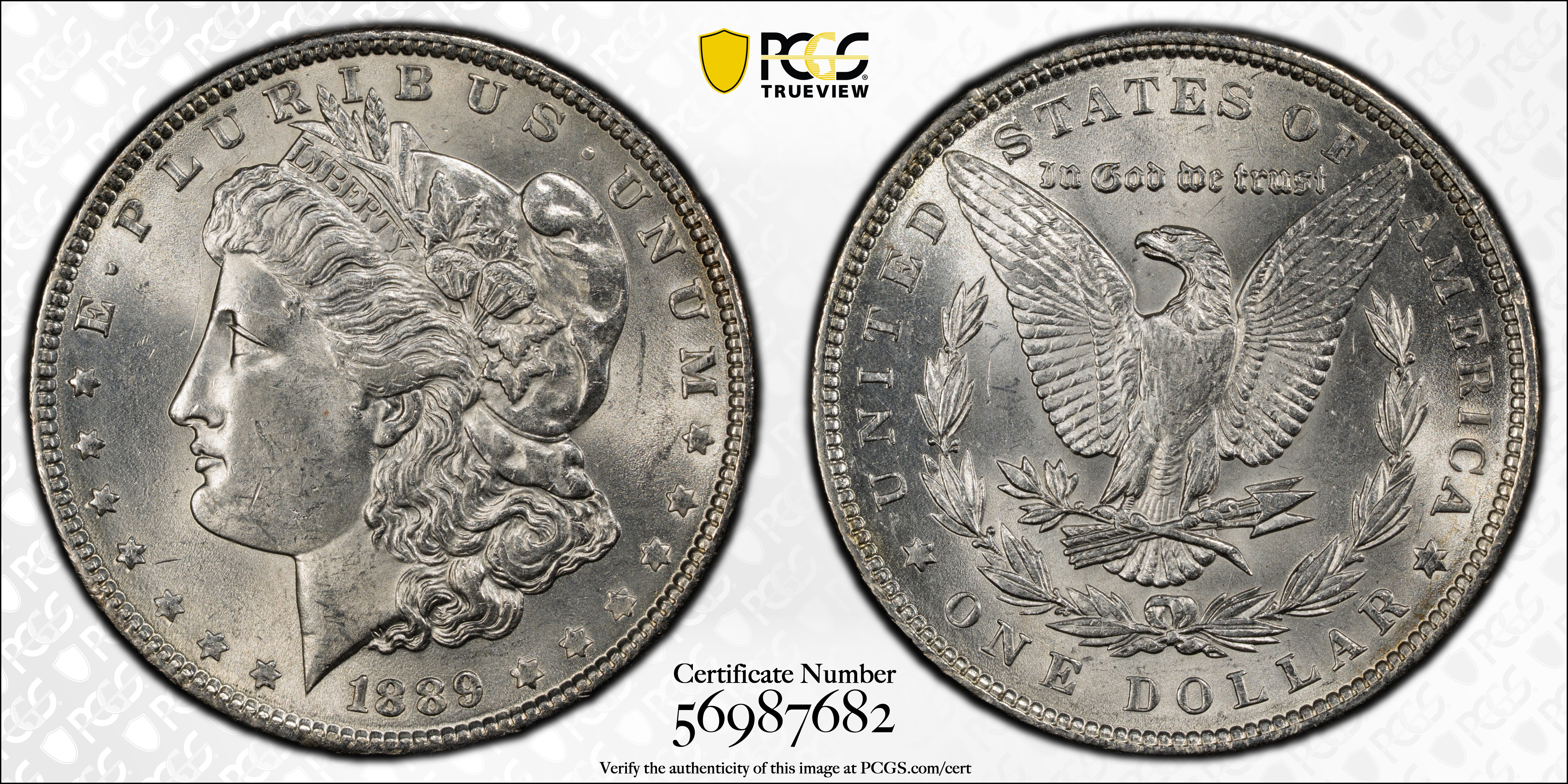 The 1889 Silver Dollar is a very common coin, with literally tens of thousands of certified Mint State examples available. Thousands of MS65 examples have been certified by PCGS, as have hundreds of MS66 and better examples. Where this date gets really rare is at the MS67 level. The finest example is a single PCGS MS68.
