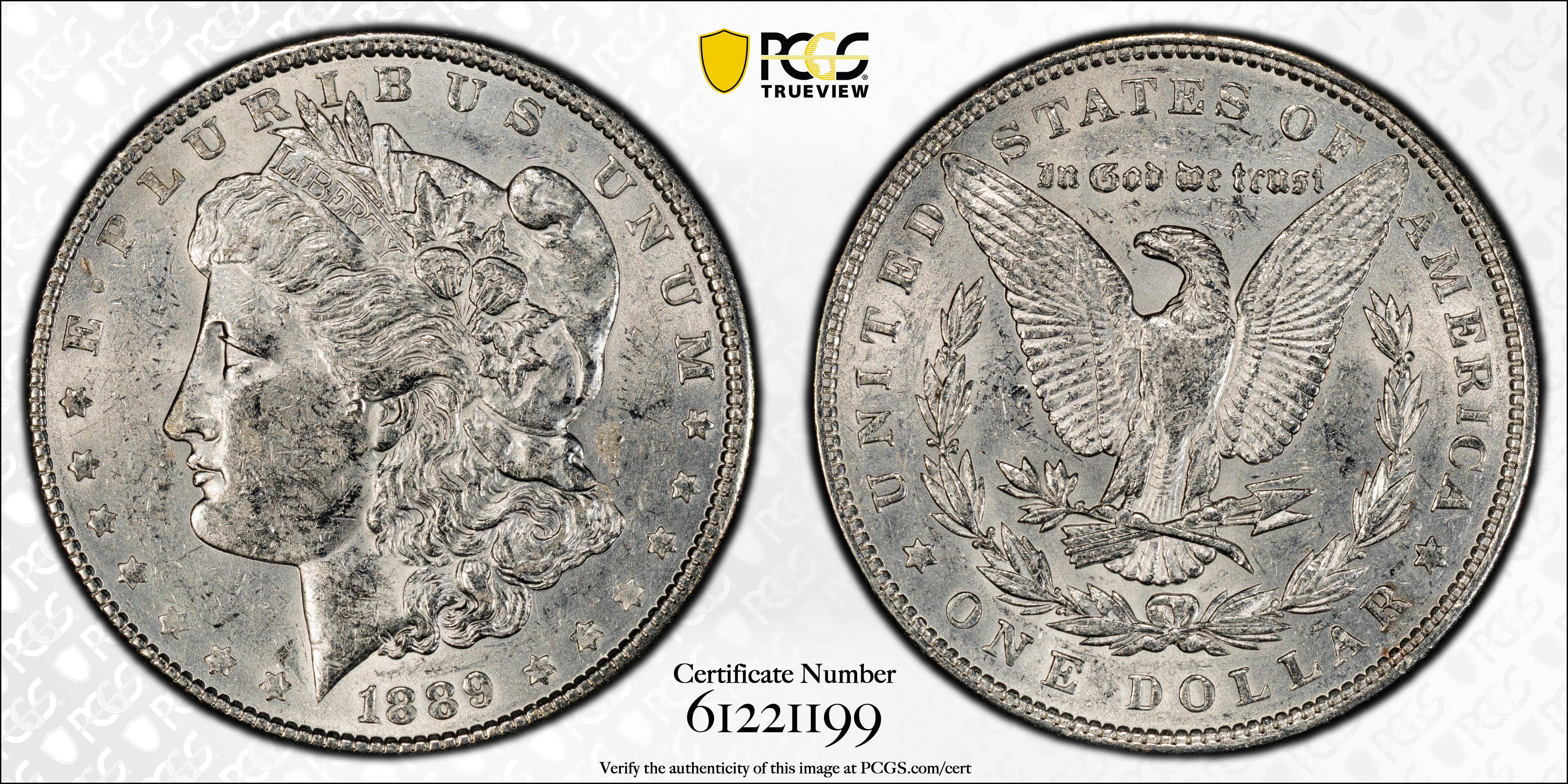 The 1889 Silver Dollar is a very common coin, with literally tens of thousands of certified Mint State examples available. Thousands of MS65 examples have been certified by PCGS, as have hundreds of MS66 and better examples. Where this date gets really rare is at the MS67 level. The finest example is a single PCGS MS68.
