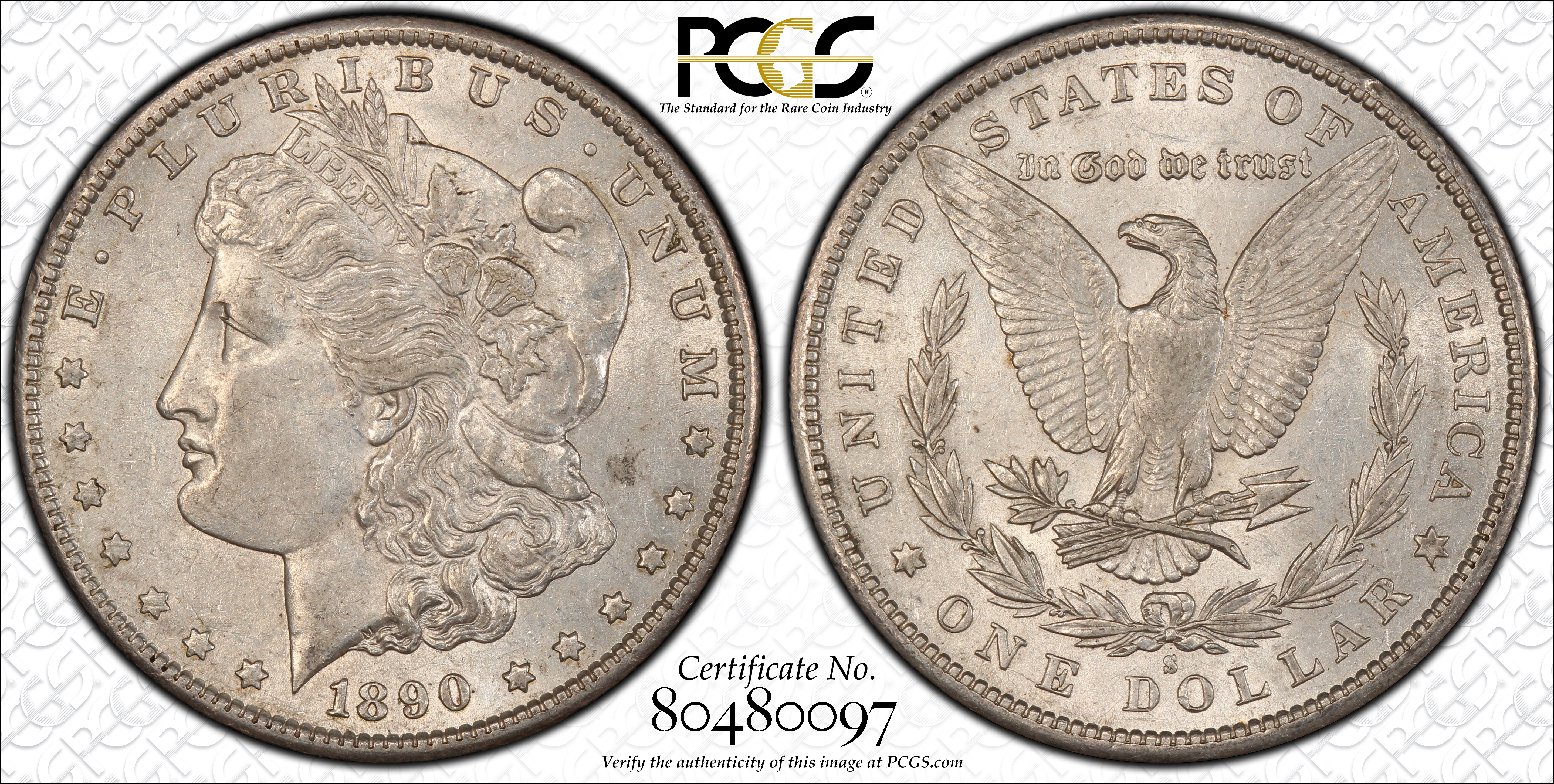 Mint State grades: The 1890-S is one of the more available Morgan dollars in Mint State, although it is not among the most common. Probably, 45,000 to 80,000 exist in the MS-60 to 62 area, although MS-63 specimens, of which an estimated 15,000 to 25,000 survive, are readily available. MS-64 coins are slightly scarce, and number about 10,000 to 18,000. MS-65 examples are scarcer yet and have a population of, perhaps, 2,000 to 3,000.