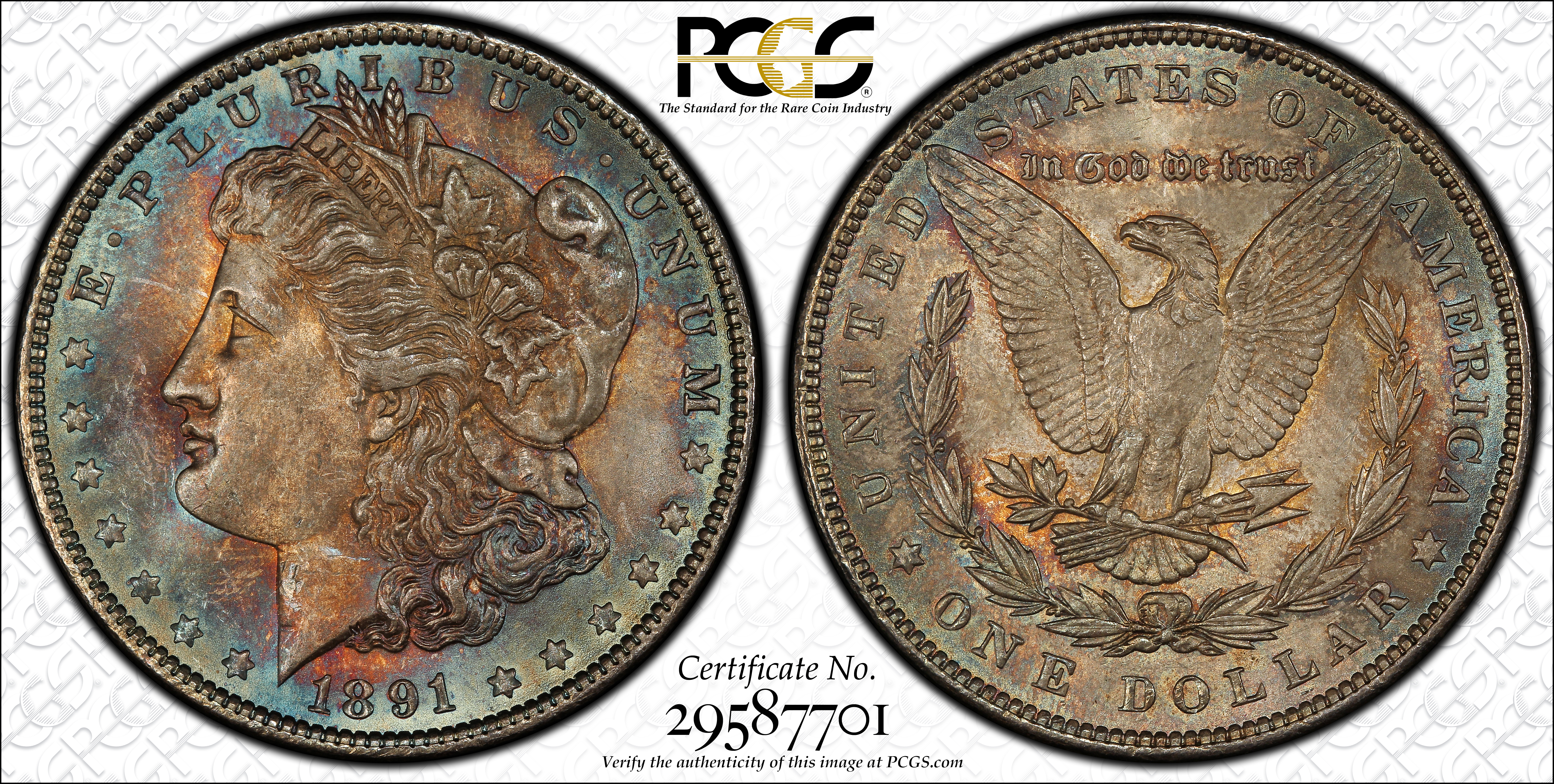 The 1891 dollar is common in lower Mint State grades but is rare at the MS-65 level.