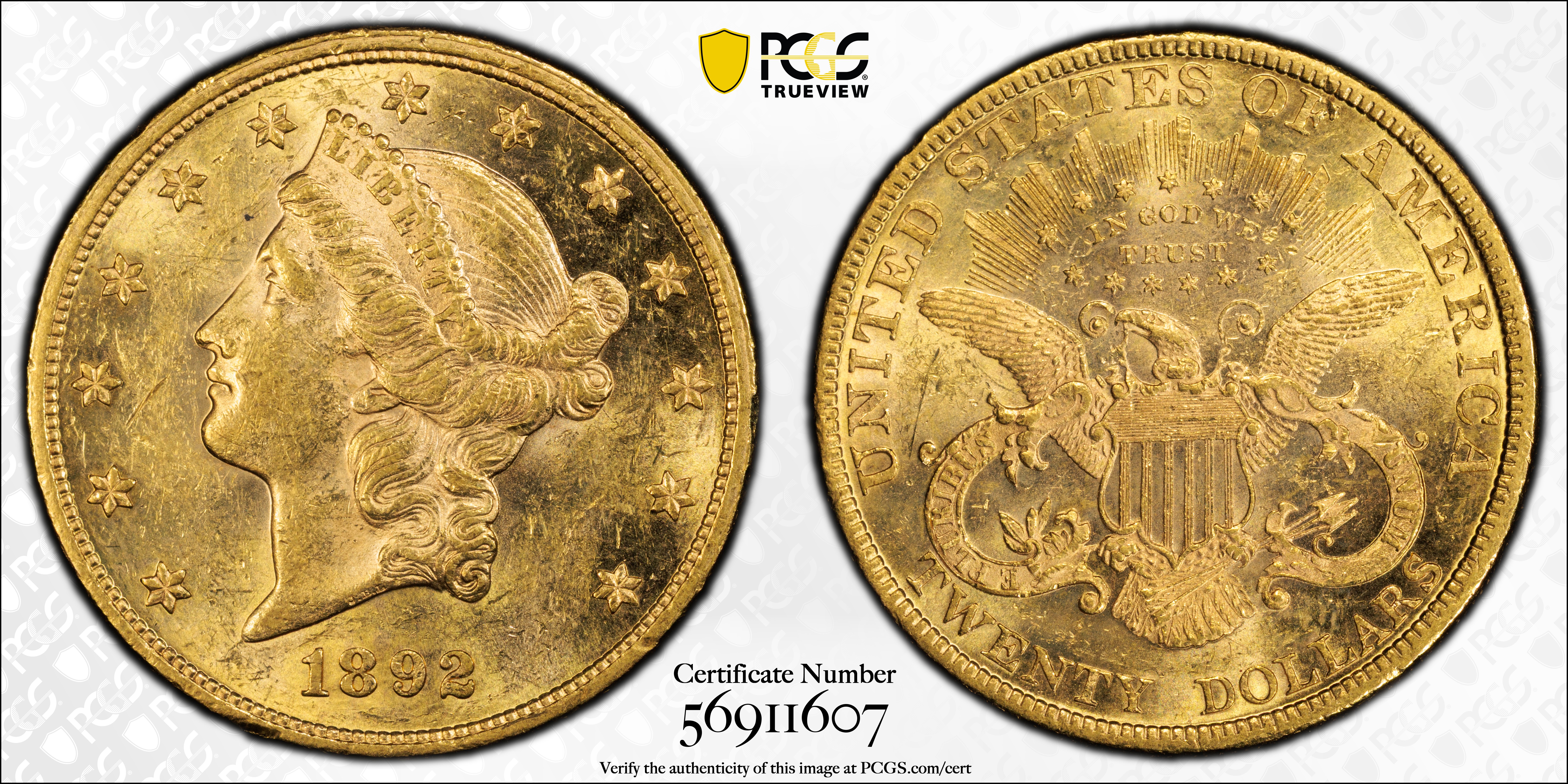 1892 $20 MS61 Certification #56911607, PCGS #9019