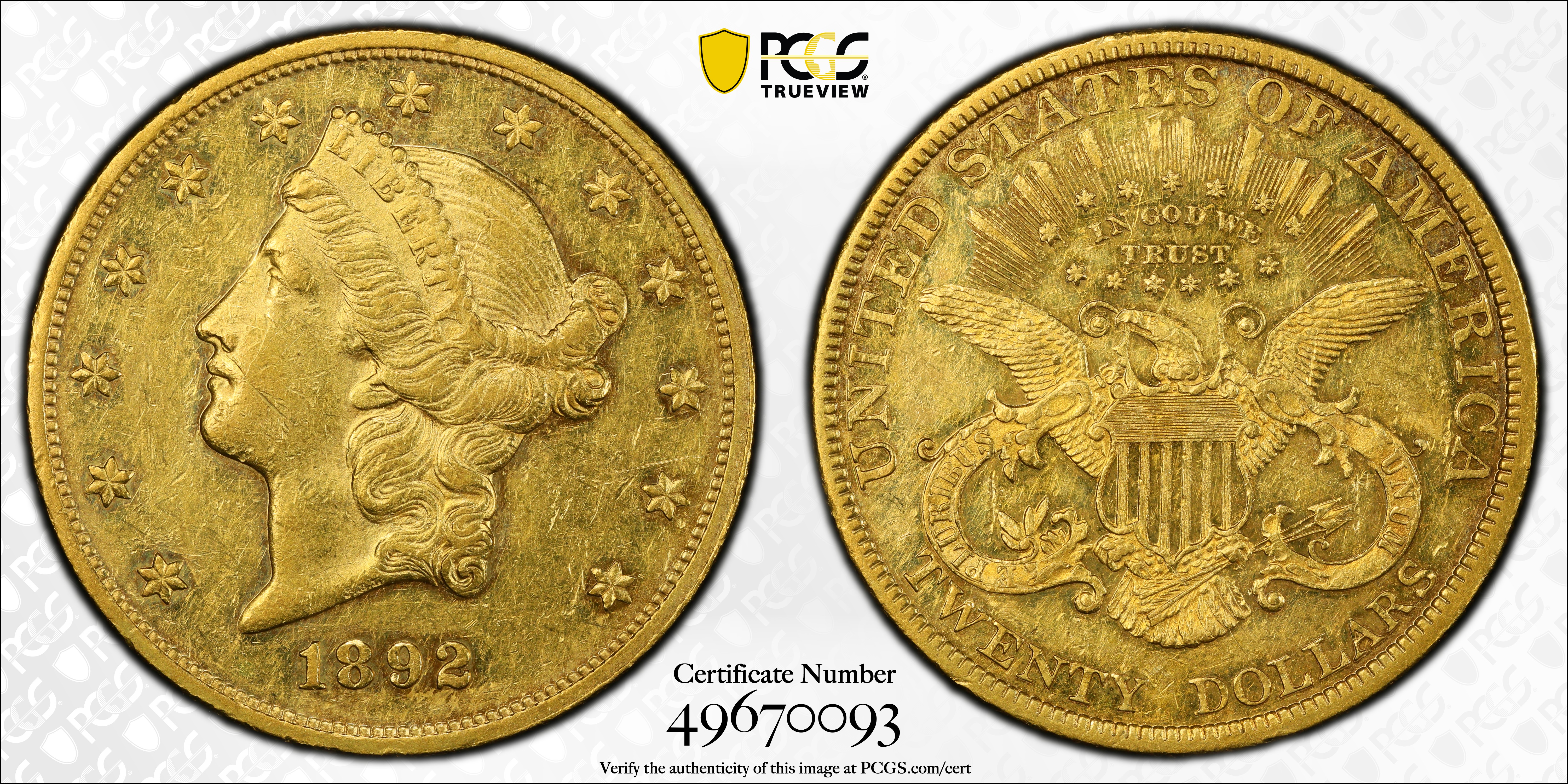 1892 $20 PR53 Certification #49670093, PCGS #9108