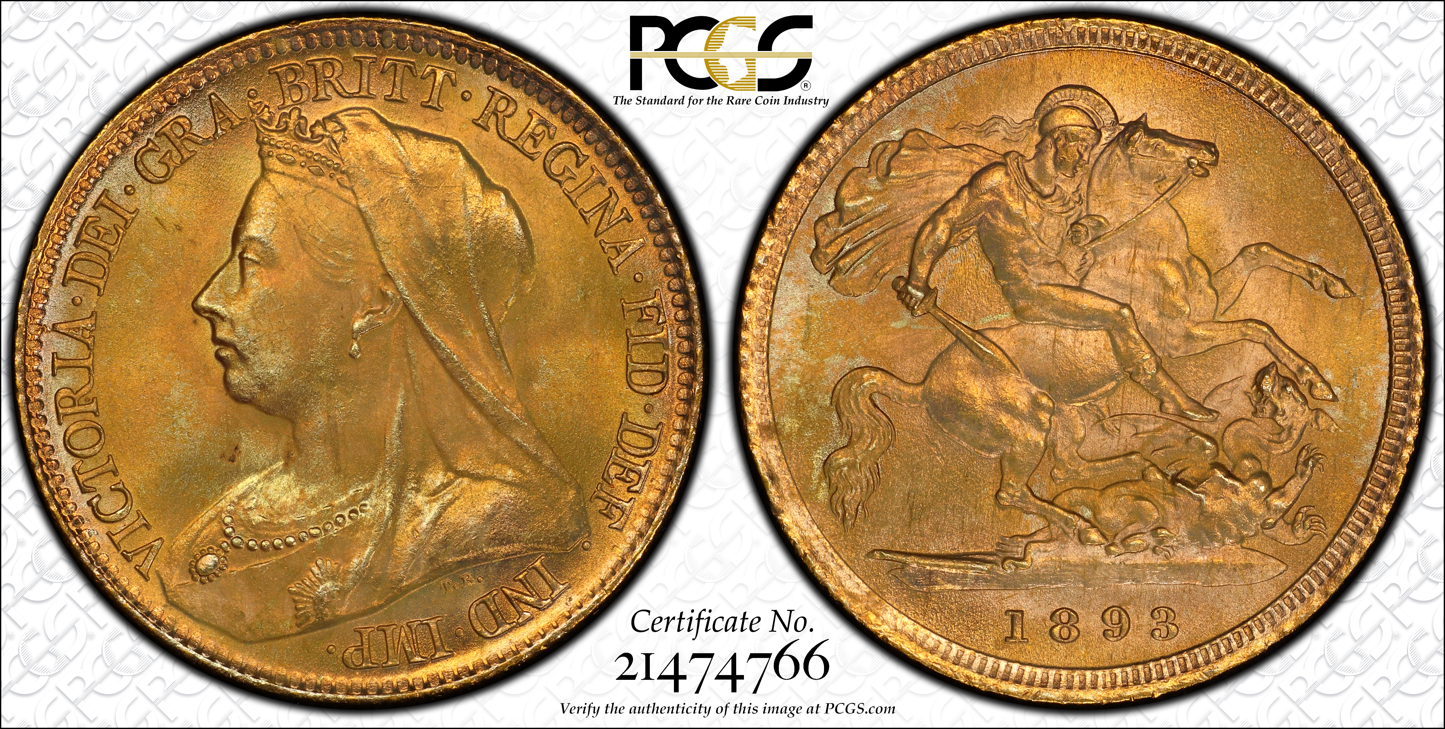 1893 1/2 Sov S-3878 Old Head MS66 Certification #21474766, PCGS #206727