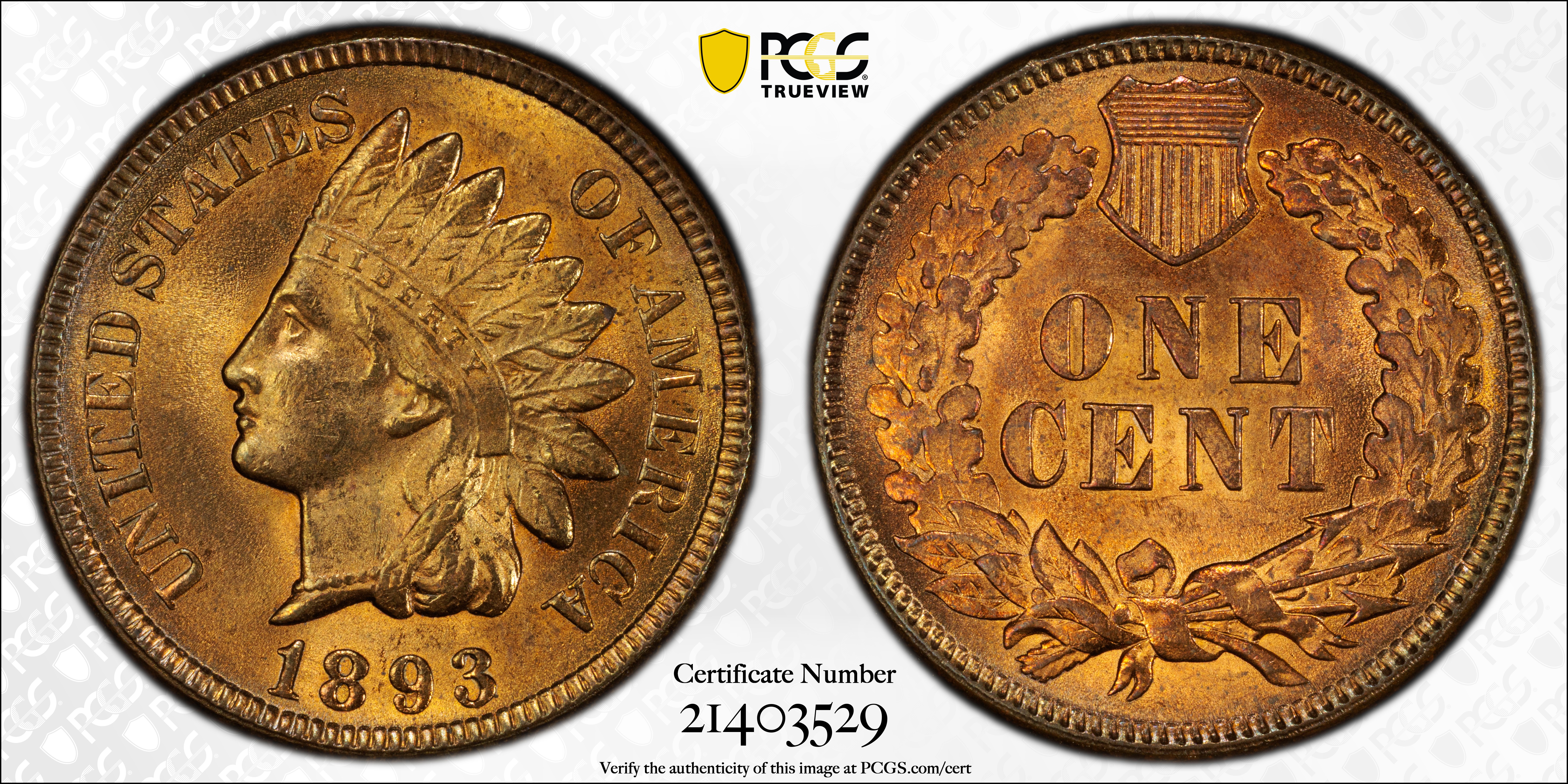 The 1893 Indian Cent has an average mintage more or less. As there are several issues from the series which have significantly lower or higher mintages. This issue appears to be scarce in MS65 condition with no more than a few hundred known in this condition. In MS66 it is even scarcer with about 100 or so examples known. Anything grading higher is considered a condition census coin and less than a few dozen or so known grading higher than MS66.