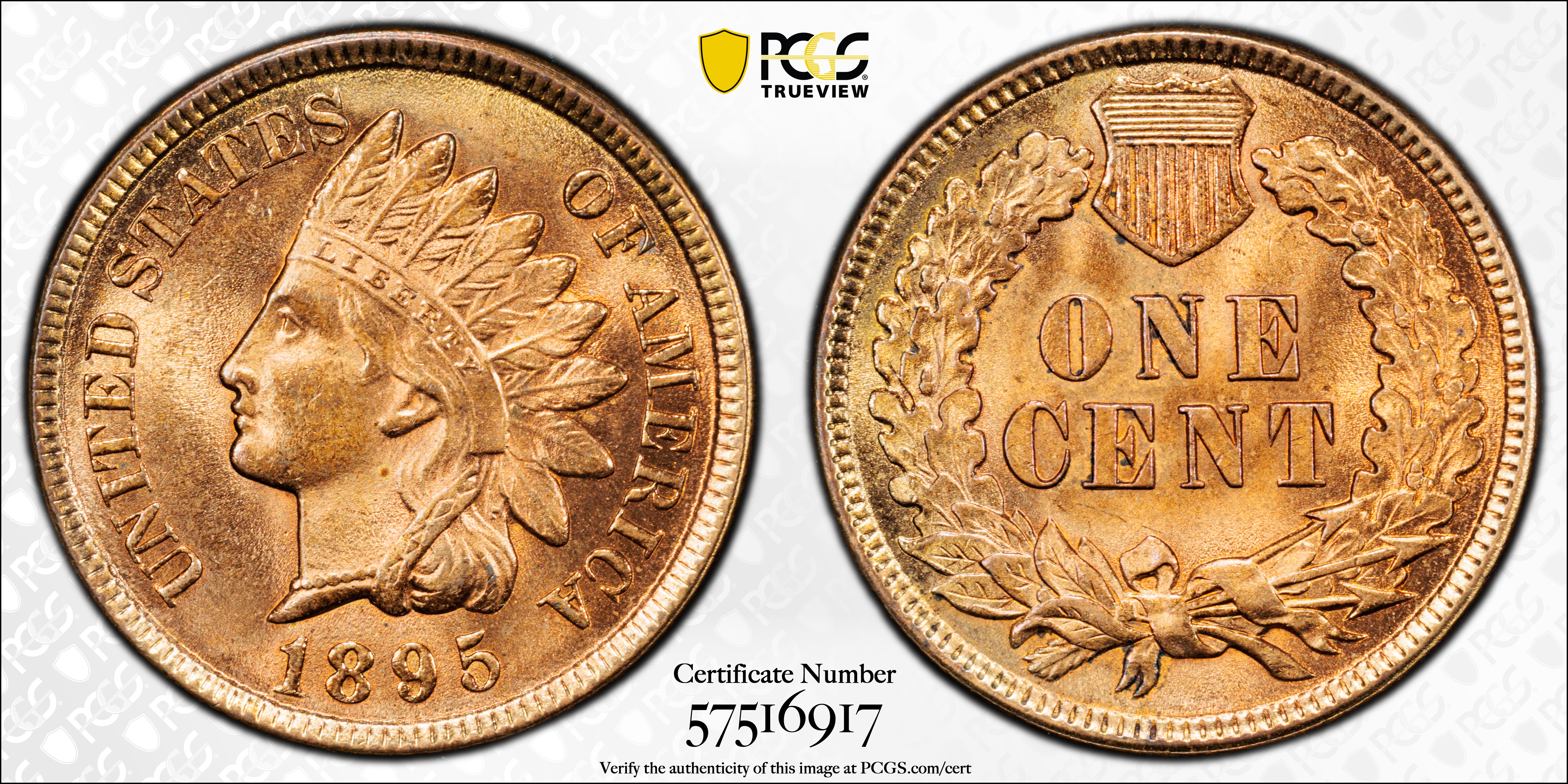 The 1895 Indian Head Cent is very common in all grades, including Mint State, where hundreds of certified examples are available in either Brown, Red-Brown, or Red. The typical, certified Mint State example rates MS64, though there are also hundreds in MS65. Because Red examples are so prevalent (and therefore affordable), collectors should put their money there. Nonetheless, the usual rules for Indian Head Cents apply -- look for strong strikes, early die states (non-grainy surfaces), and spot-free surfaces.