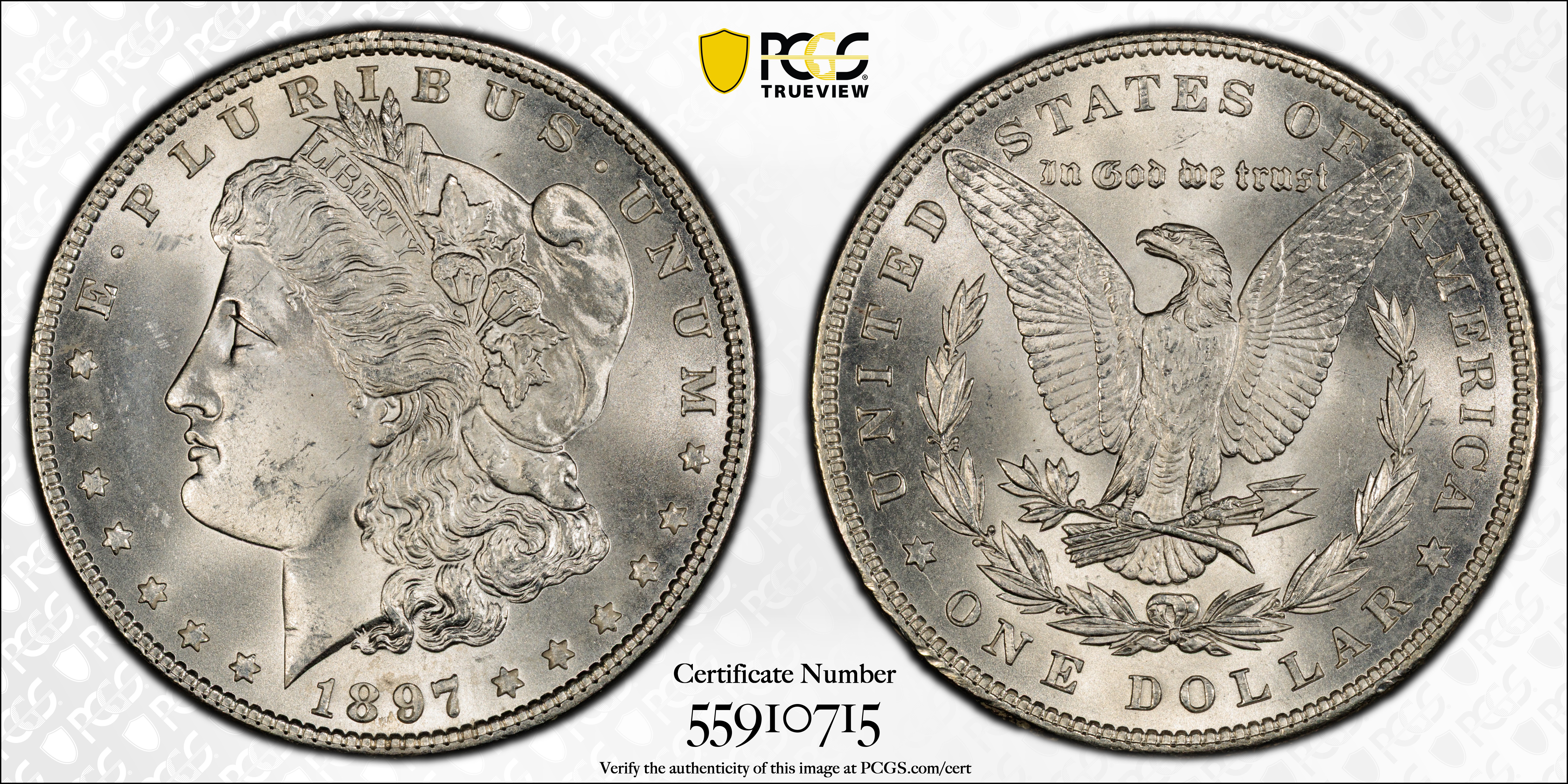 Mint State grades: Mint State 1897 dollars are common in all levels, although in MS-65 they are not among the top 10 most common Morgan dollar dates. Most are well struck and have satisfactory lustre. Others, particularly those in grades from MS-60 through 63, can have grayish, "greasy" surfaces.